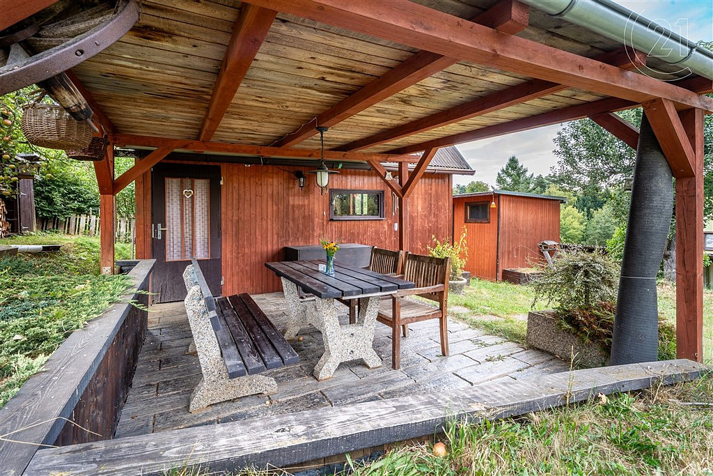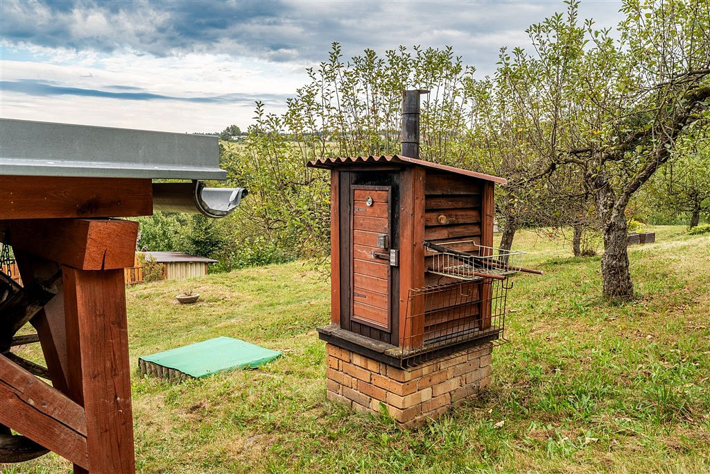 Nemovitost se pyšní pozemkem o rozloze 913 m², který nabízí vše, co od rekreačního bydlení očekáváte. Zahrada je pečlivě udržovaná a vybavená – nechybí zde zastřešená pergola s posezením, udírna, zahradní domek na nářadí ani prostor pro zahradničení či odpočinek.