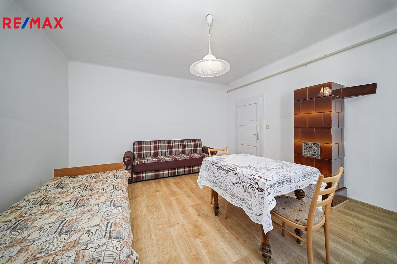 Za vstupními dveřmi je prostorná chodba se vstupem do kuchyně o výměře 14 m², nechybí zde komora a milovníci tradičních prvků jistě ocení původní kachlový sporák. Kuchyně je přímo propojená s obývacím pokojem o výměře 23 m², jehož dominantou jsou zachovalá kachlová kamna, která kromě estetické hodnoty nabídnou i příjemné sálavé teplo. V domě se dále nachází ložnice o výměře 15,7 m² a další pokoj o výměře 14 m², který může sloužit například jako dětský pokoj nebo pracovna. Koupelna o výměře 4 m² je vybavena velkým sprchovým koutem a toaletou.