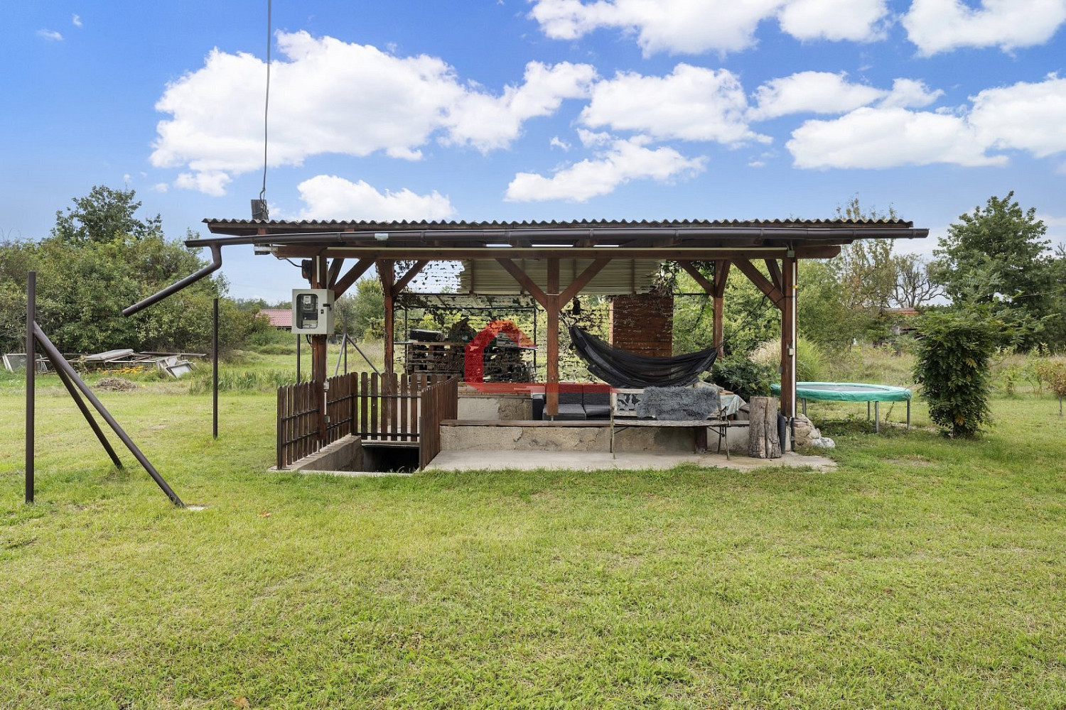 Na pozemku se nachází nejen mobilheim s plochou 37,8m² a dispozici 3+1, ale i dva zastřešené altány o plochách 13,5m² a 12,2m² , dále sklep o ploše 10,6m² , vrtaná studna a jímka.