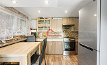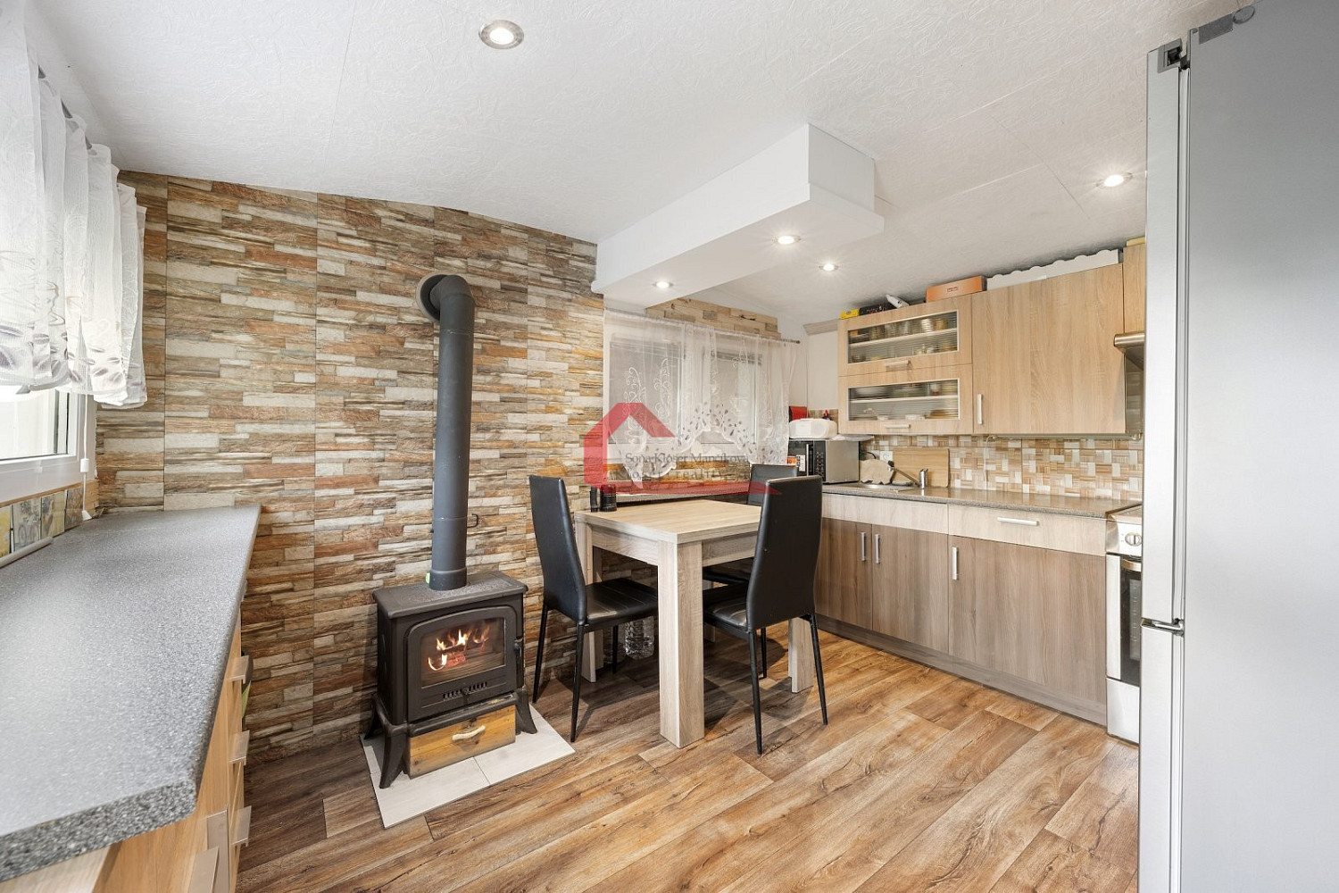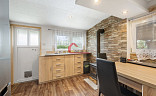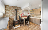 * kuchyně kde součástí vybavení je kuch. linka, el. sporák, digestoř, jídelní stůl se židlemi, botník, komoda, litinová kamna