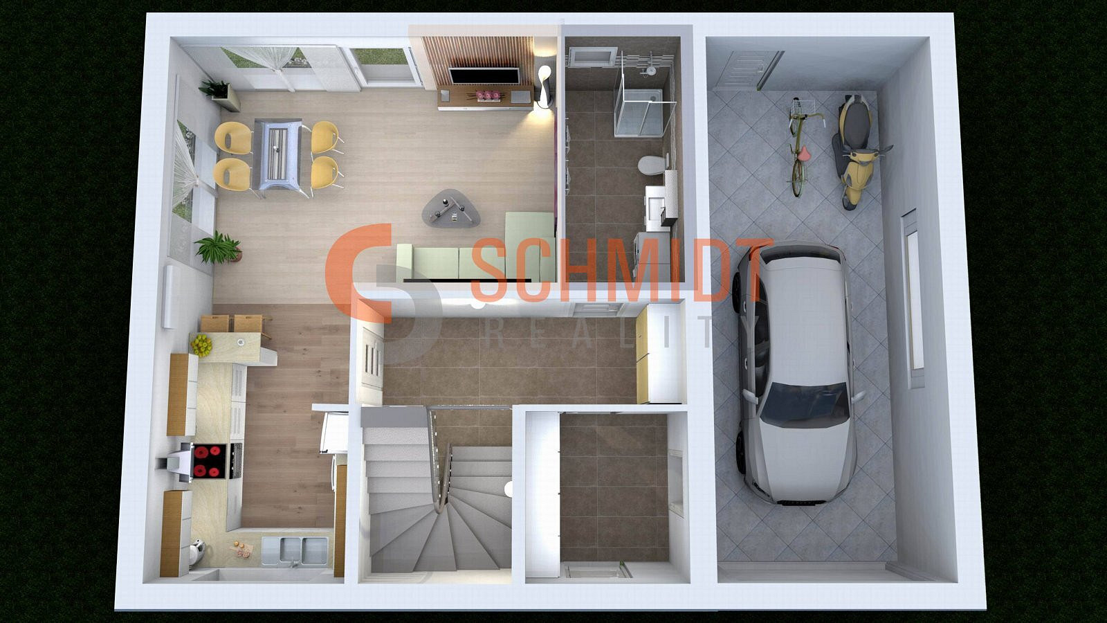 V přízemí domu je navržen prostorný obývací pokoj s výstupem na terasu, kuchyní a jídelnou, koupelna se sprchou, wc a technickým zázemím (pračka, sušička), zádveří s hlavním vstupem z ulice i vstupem do garáže, chodba se schodištěm do druhého podlaží a úložným prostorem pod schody. V neposlední řadě garáž, pro jeden automobil, propojena s domem i vstupem do zahrady.