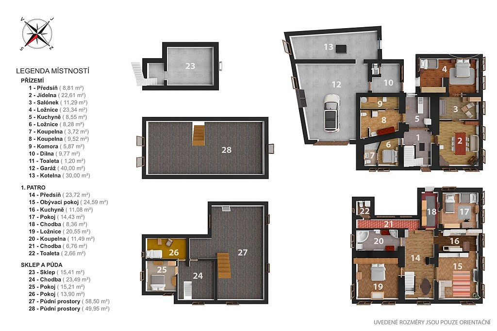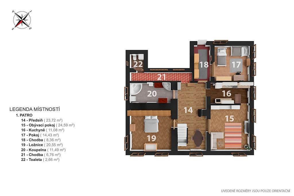 5 pokojů, společenský salonek, 2 kuchyně, 2 koupelny a velkou jídelnu