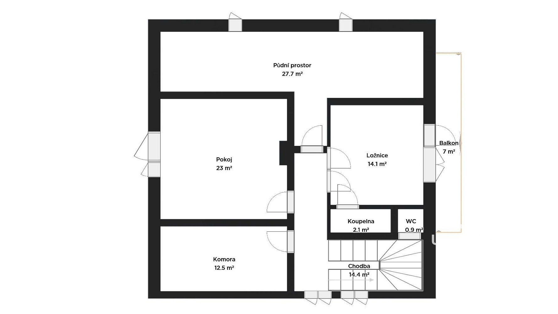 Plocha půdních prostor, které jsou v úrovni pokojů, lze využít jako další obytné místnosti 2. NP : 40m²