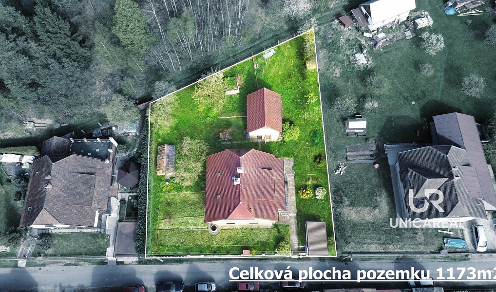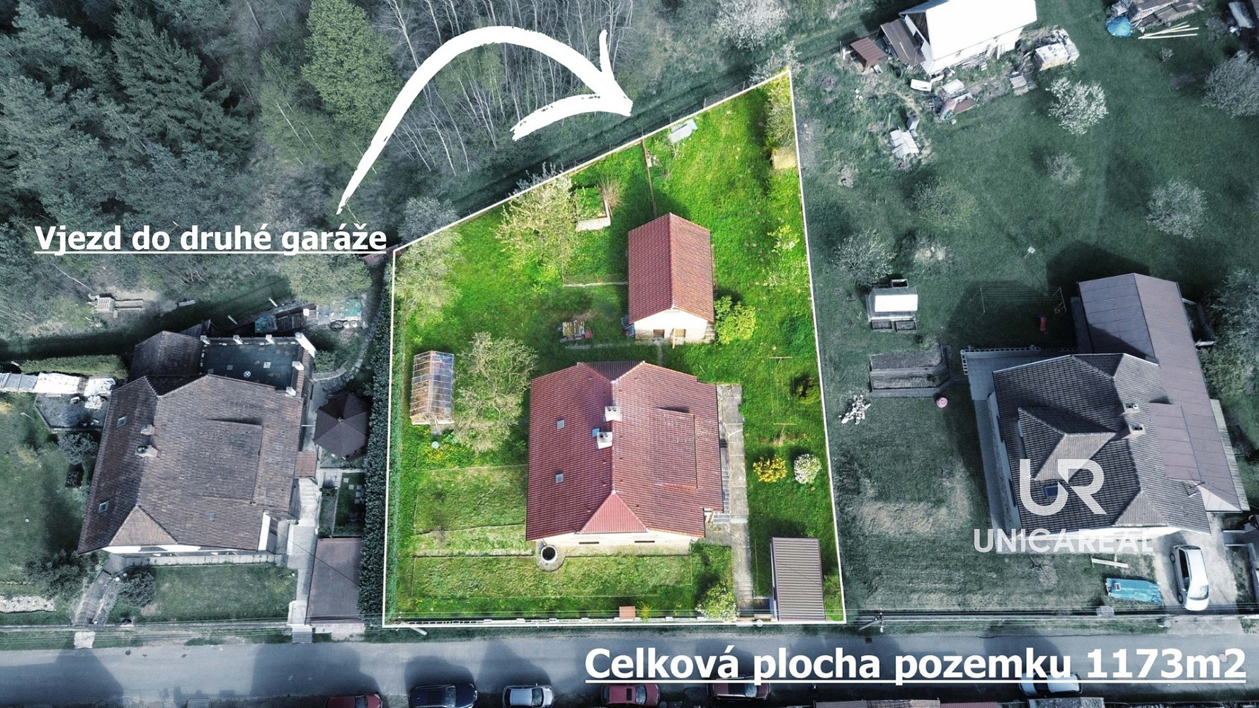 Pozemek o rozměru 1173m² leží ve svahu a proto jsou zde krásné výhledy do krajiny. Na pozemku se nachází hlavní budova, přístavba a spodní garáž. K přístavbě, kde je horní garáž, se vjíždí horní bránou po nezpevněné cestě. Pro lepší představu o situaci pozemku jsou přiloženy v prezentaci fotografie z dronu.