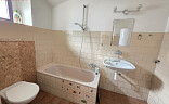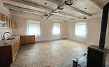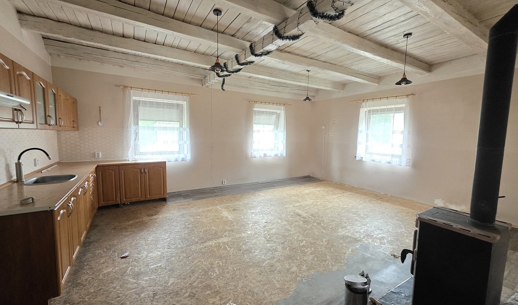 Dispoziční řešení - v přízemí domu se nachází vstupní chodba, prostorný pokoj s kuchyňským koutem a krbovými kamny, menší obytná místnost a koupelna s vanou a toaletou, po dřevěných schodech vyjdeme do patra, kde jsou 4 obytné místnosti a samostatná toaleta. Nově byl instalován elektrický bojler a rozvody elektřiny.