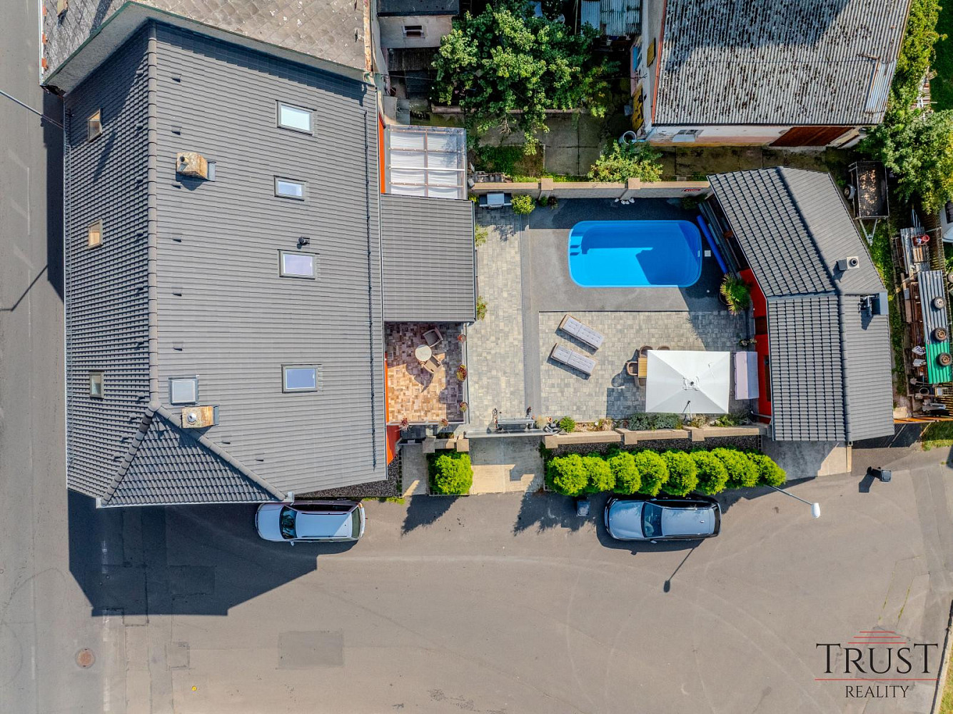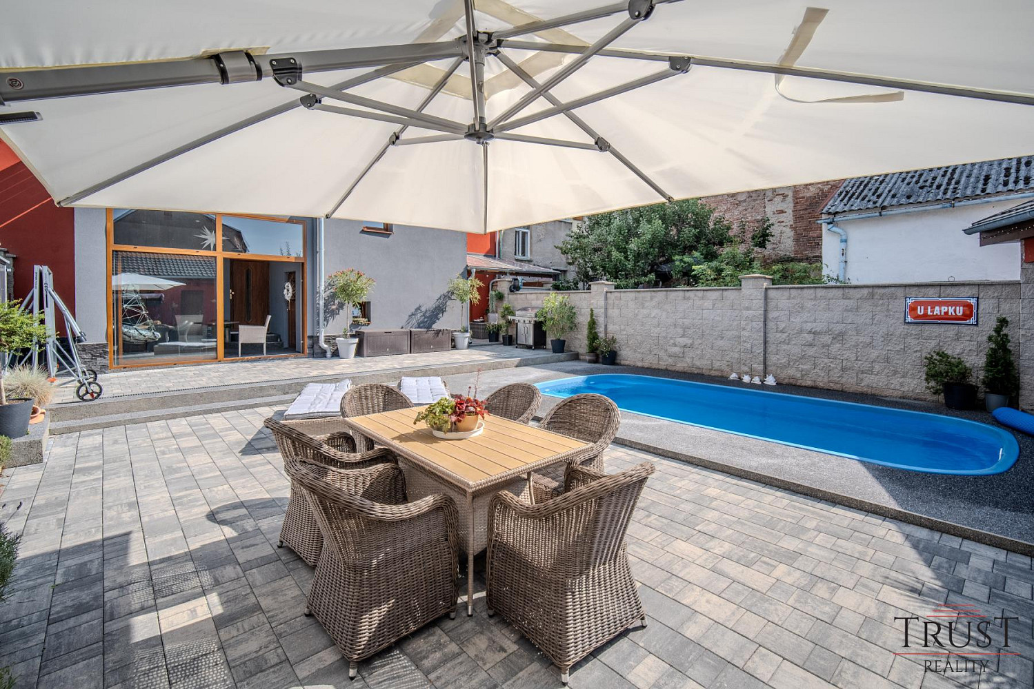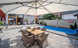 Na pozemku se nachází slaný bazén, který poskytuje ideální místo pro relaxaci. Dva komíny, oba vyvložkované a plně funkční, umožňují variabilitu vytápění a další možnosti. Moderní technologie zahrnují plynový kotel Viessmann (35 kW) a bojler Dražice (200 litrů), který zajistí komfortní vytápění a ohřev vody. Dům je napojen na obecní vodovod i kanalizaci, takže se nemusíte starat o žádné další investice do infrastruktury. Pro větší bezpečnost a pohodlí jsou téměř na všech oknech předokenní rolety. K parkování slouží prostorná garáž s vraty, která lze pohodlně ovládat přes telefon.