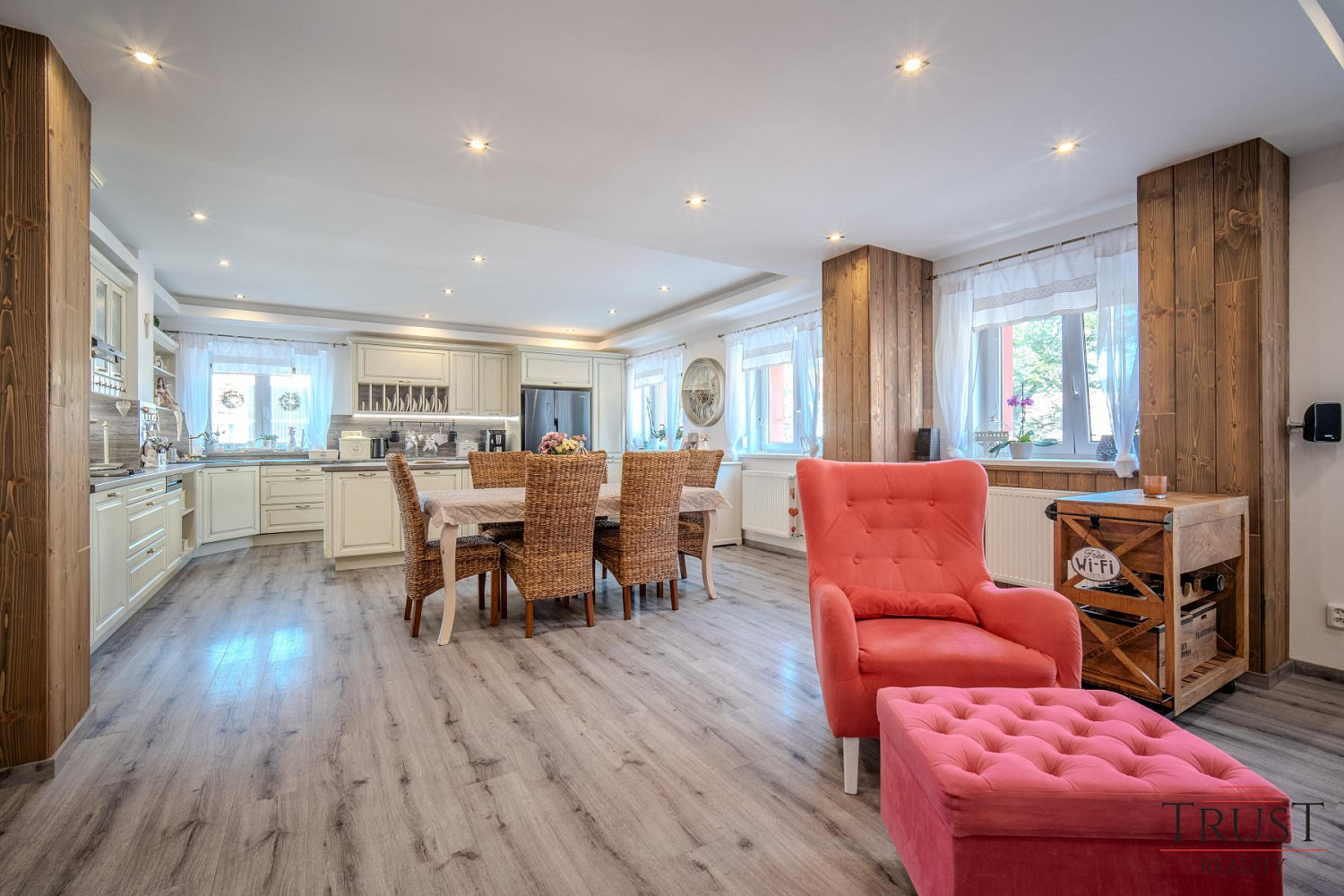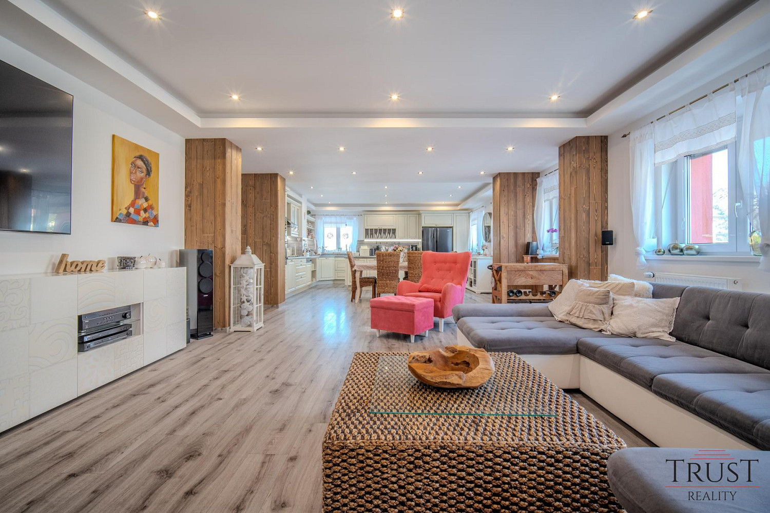 Dům má 6 ložnic a 2 prostorné obývací pokoje, což je ideální pro velké rodiny nebo dvougenerační bydlení. Nechybí zde ani 2 krásné terasy, kde si můžete vychutnat chvíle odpočinku a 2,5 kuchyňské linky vyrobené na míru od truhláře. Dvě koupelny a jedna samostatná toaleta poskytují dostatek pohodlí pro celou rodinu. Dům je vybaven vinylovými podlahami a dlažbou v luxusním provedení, které dodávají interiéru moderní a elegantní vzhled.