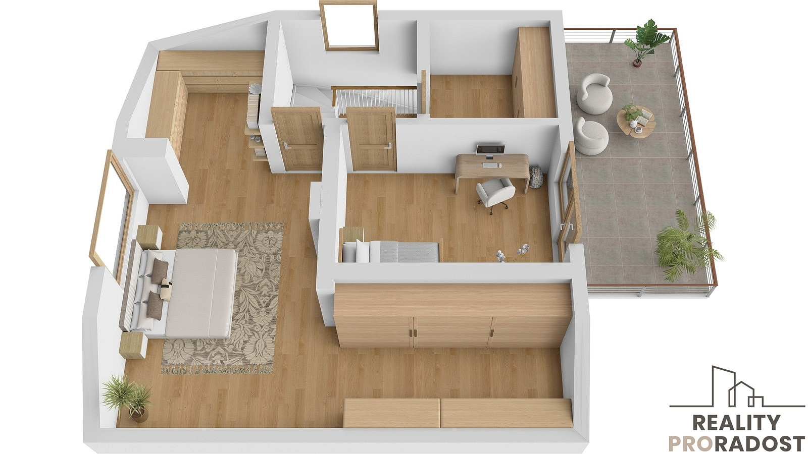 V patře jsou 2 pokoje k dokončení. Jeden s velkou terasou, kde je třeba položit podlahu a je téměř hotovo. Ve druhém pokoji je toho k dokončení více. Malá místnost v patře je pak ideálním místem ke zbudovaní další koupelny.