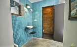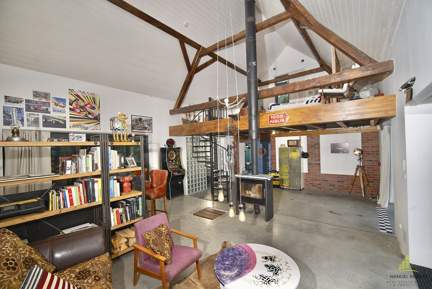 V přízemí se nachází prostorný obývací pokoj s kuchyní, odkud je přímý vstup na zastřešenou terasu – ideální pro chvíle odpočinku a tiché ranní kafe s výhledem do zeleně. Součástí dolního patra je také prostor původně určený pro historické auto či motorky, designová sprcha obložená průhledným sklem, toaleta a technická místnost.
