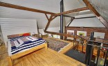 V patře se nachází otevřená ložnice s přístupem na terasu, odkud díky nízkému zábradlí můžete vnímat celý prostor chaty i výhled do obývací části.