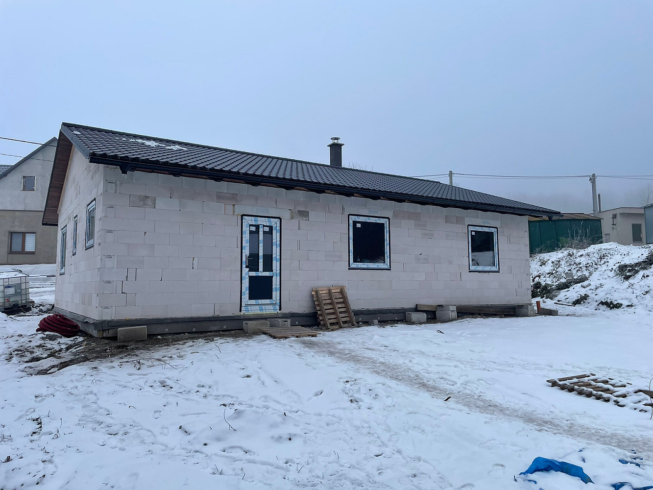 Hrubá stavba má sedlovou střechu s krytinou z taškoplechu, je osazena kvalitními plastovými dveřmi a okny s trojsklem. V domě jsou již nainstalovány rastry na SDK a zatepleno minerální vatou.