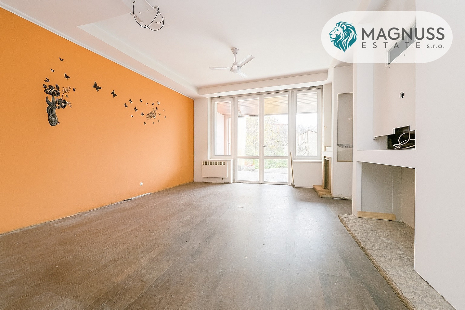 Z obývacího pokoje je přímý vstup na terasovou část se zahradou, ideální pro odpočinek nebo rodinné posezení.