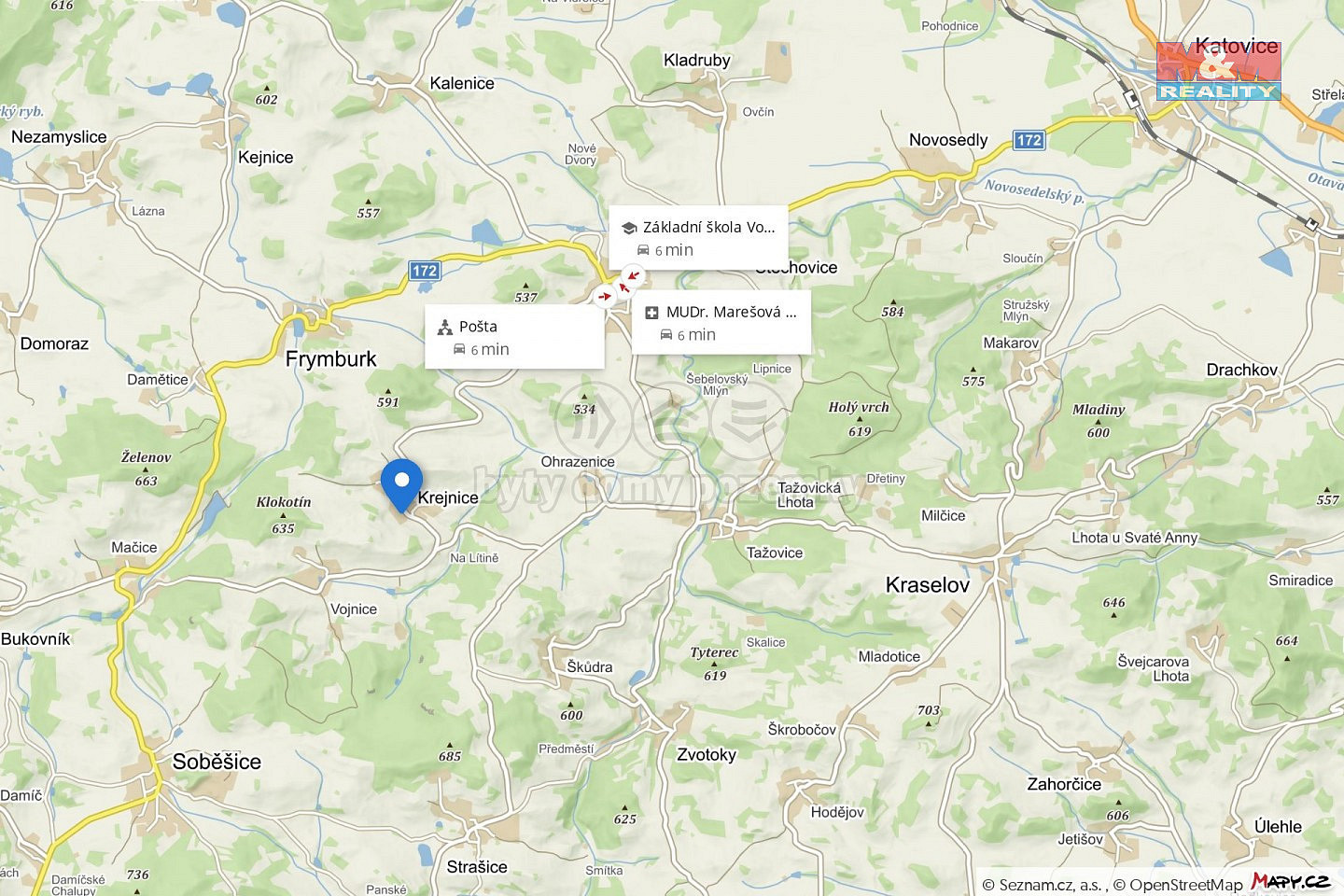 Nabízím k prodeji dům v klidné obci Krejnice, jen 18 kilometrů od Strakonic. Veškerou občanskou vybavenost najdete ve Volenicích, které jsou vzdálené pouhé 4 kilometry – obchod, pošta, školka, škola i lékař. Dům má nová plastová okna a střechu z betonových tašek, takže největší investice jsou už vyřešené. K nemovitosti patří zahrada se skleníkem, vzrostlými ovocnými stromy a také kůlna, kterou lze jednoduše přestavět na krytou pergolu pro posezení s rodinou nebo přátele. Vnitřní dispozice nabízí dostatek prostoru pro vybudování půdní vestavby a tím i zvětšení obytné části. Vytápění je řešeno elektrickým kotlem nebo tuhými palivy, k dispozici jsou i krbová kamna, která dokreslují příjemnou atmosféru domu. Rozvody topení jsou nové, takže dům je připraven k okamžitému využití a čeká jen na nového majitele.