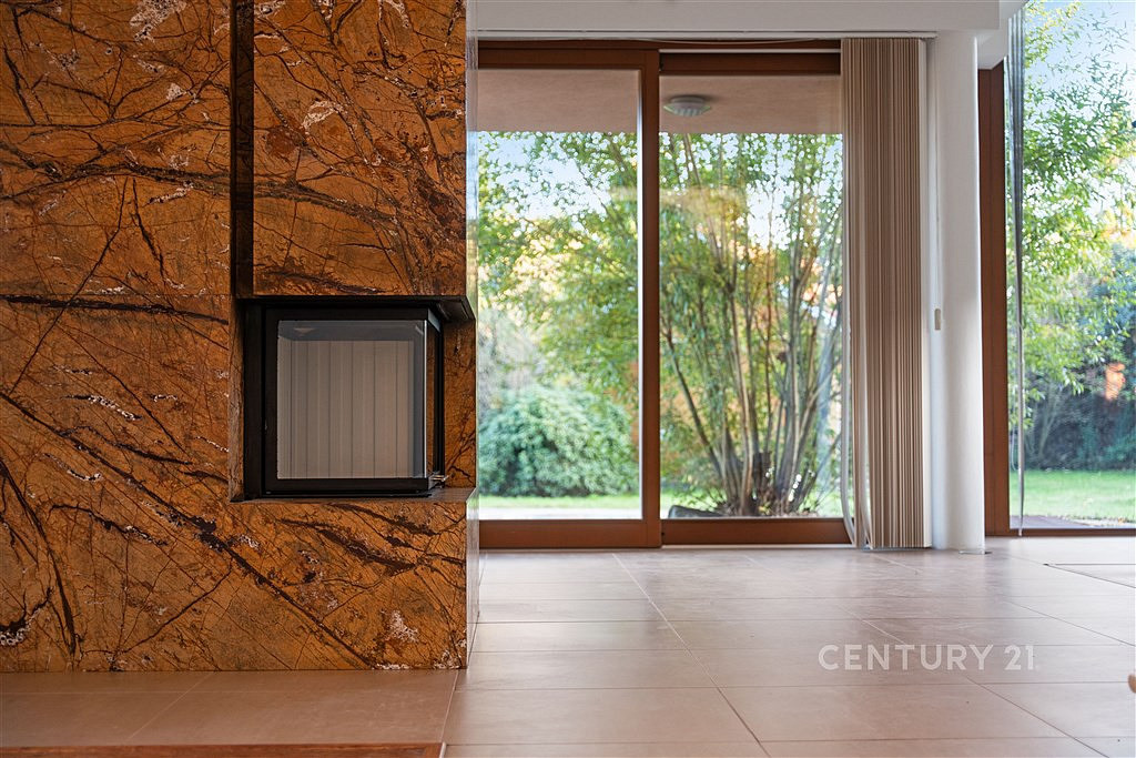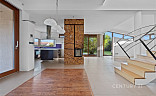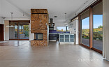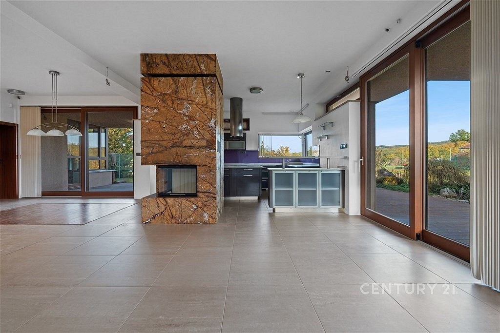 Přízemí domu je srdcem celé vily. Otevřený obytný prostor s kuchyní a jídelnou o rozloze 63,75 m² působí vzdušně a reprezentativně. Dominantou interiéru je krb s onyxovou stěnou, do které jsou zasazeny polodrahokamy.