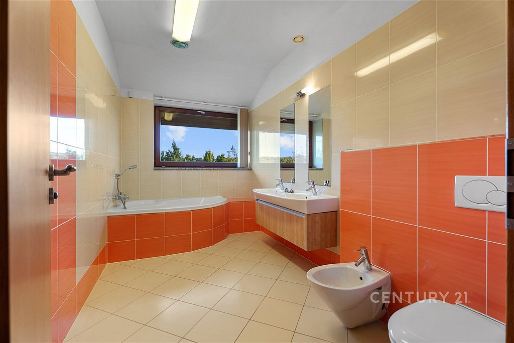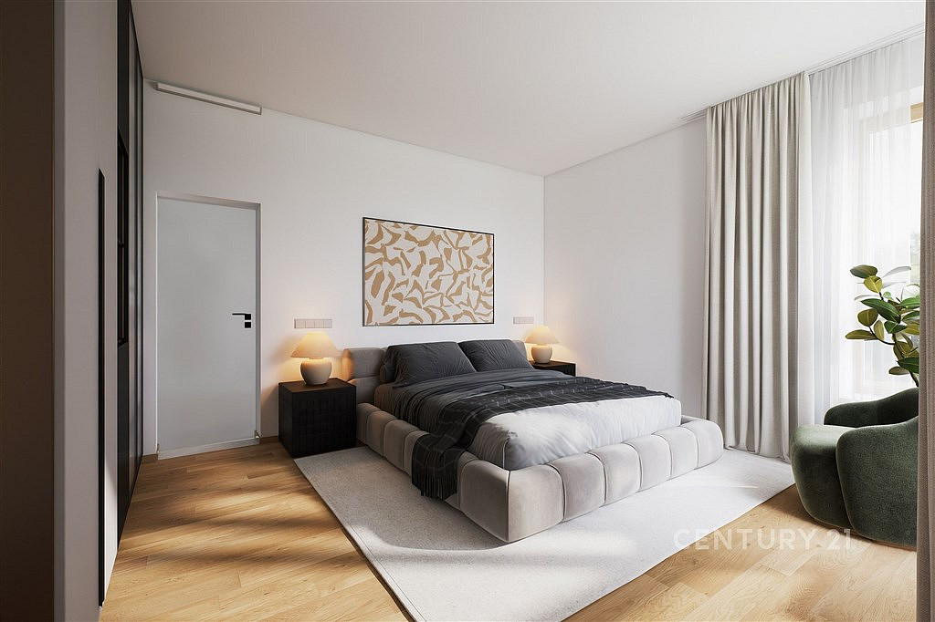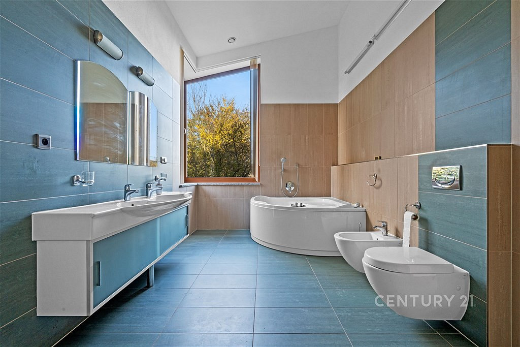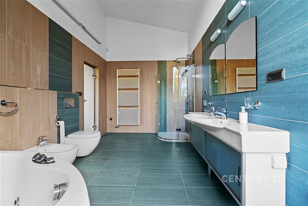 V přízemí se dále nachází luxusní master bedroom s vlastní koupelnou, samostatné WC a vstup do dvojgaráže přímo z interiéru.