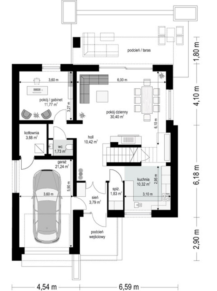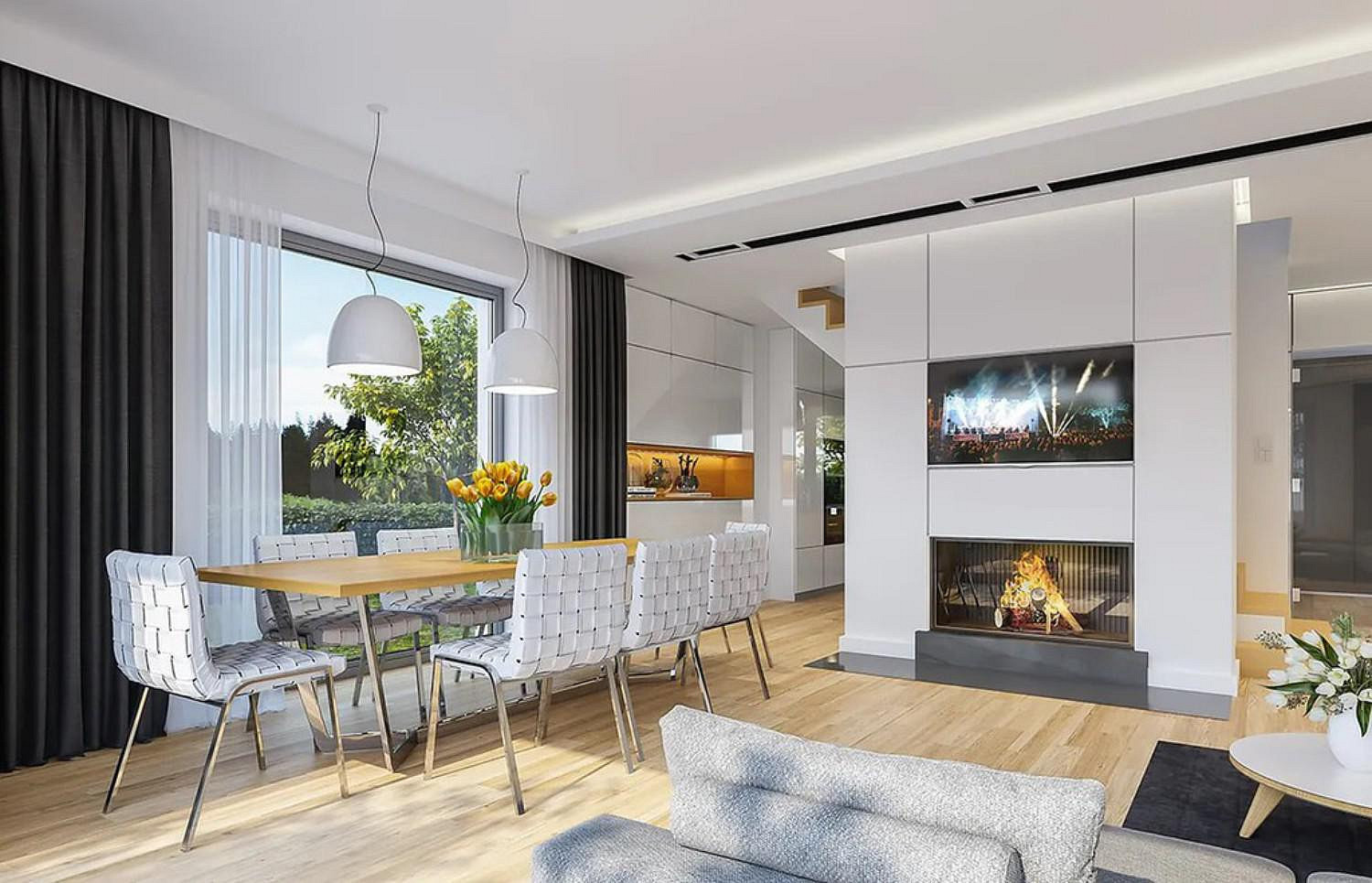 Projekt domu Mirandela je návrhem pro investory, kteří chtějí postavit dvoupodlažní dům, ale mají pozemek, na kterém urbanistická ustanovení takovou možnost vylučují. Návrh domu, přestože vypadá téměř jako dvoupatrová budova a má horní patro s místnostmi prakticky bez sklonu, je tedy formálně projektem domu s podkrovím. Architektura domu Mirandela je moderní - velké prosklení, vodorovné pruhy fasádních úprav v kontrastních barvách, přidané jednopatrové bloky předsazené garáže a zastřešení terasy se snoubí v atraktivní celek. Kompaktní tělo domu je kryto valbovou střechou. Vzhledem k rozdílu ve výšce střechy v prvním patře jsou vsazena velká okna osvětlující místnosti horního patra. Interiér domu: do domu vstupujeme pohodlným zádveřím do předsíně a do jednoprostorové obytné části s možným krbem a TV stěnou vystavenou uprostřed obývacího pokoje, v pozadí schodiště do patra. Z přední strany máme komfortní kuchyň se spíží a ze zahrady další pokoj - pracovnu a toaletu. Z haly jdeme také do garáže a kotelny. Velké prosklení obývacího pokoje otevírá interiér domu na krytou terasu a okolní zahradu. V patře máme samostatný byt rodičů s vlastní koupelnou a šatnou a dva dětské pokoje se společnou koupelnou. V podkroví bylo dosaženo výšky stání téměř po celé ploše - nejsou zde žádné šikminy, které by ztěžovaly pohyb. Návrh domu Mirandela i přes celkově malou užitnou plochu obsahuje veškerý potřebný funkční program pro plně pohodlný život vícečlenné rodiny. Dům byl navržen z moderních a energeticky úsporných materiálů.