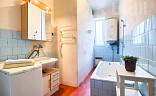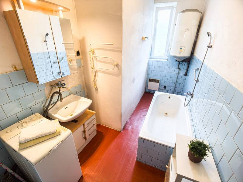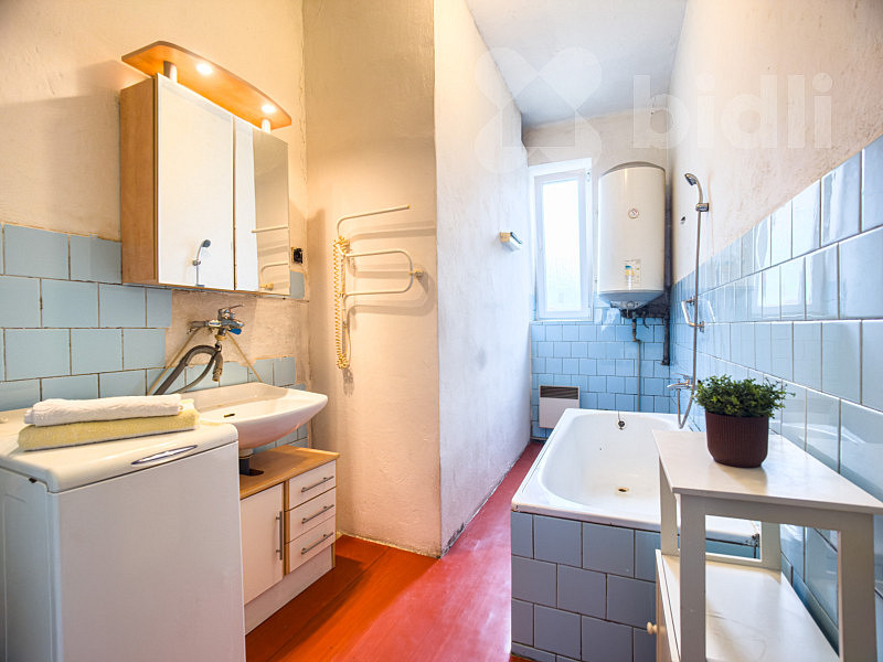 Koupelna s vanou, bojlerem, prostorem na pračku a umyvadlem. Samostatné WC. Praktická špajzka s oknem.