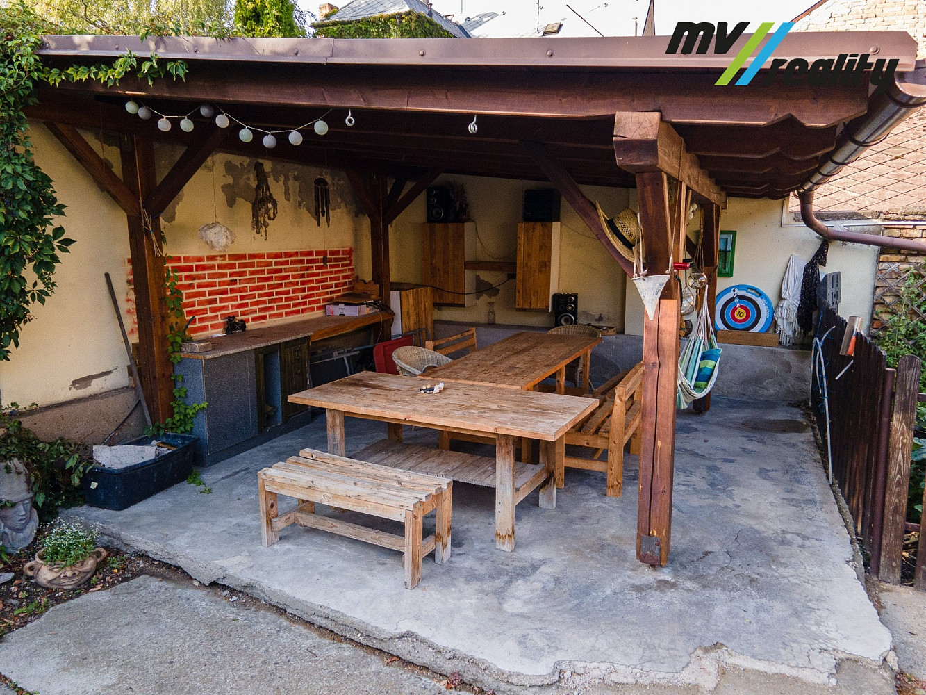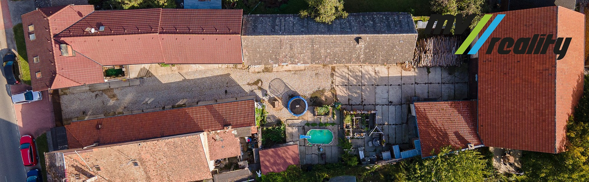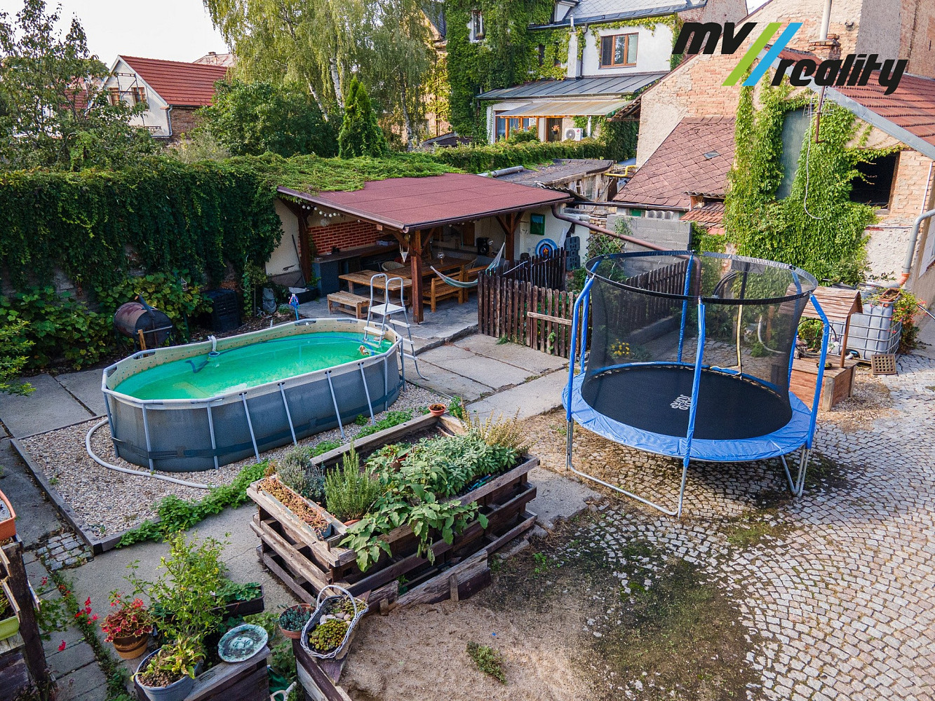 Dvůr je dlážděný, kde je pergola a nadzemní bazén.