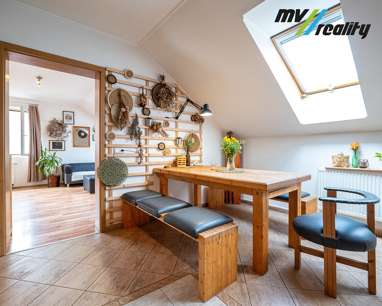 V 1. patře je druhá bytová jednotka 4+1, kde z chodby přijdeme, z jedné strany do koupelny, na samostatné WC a projdeme do 2. chodby, kterou dojdeme do ložnice a pokoje. Z druhé strany přijdeme do obývacího pokoje a kuchyně, kde jsou střešní okna.
