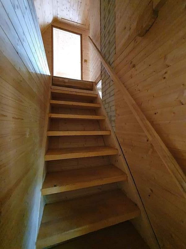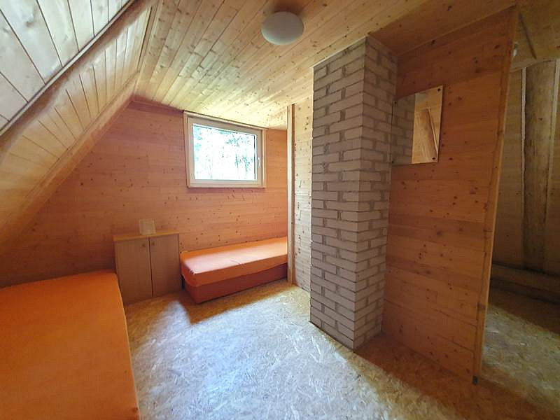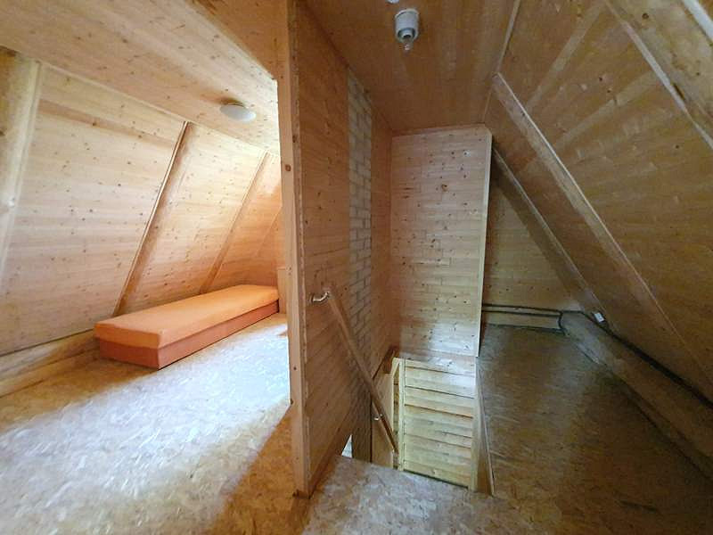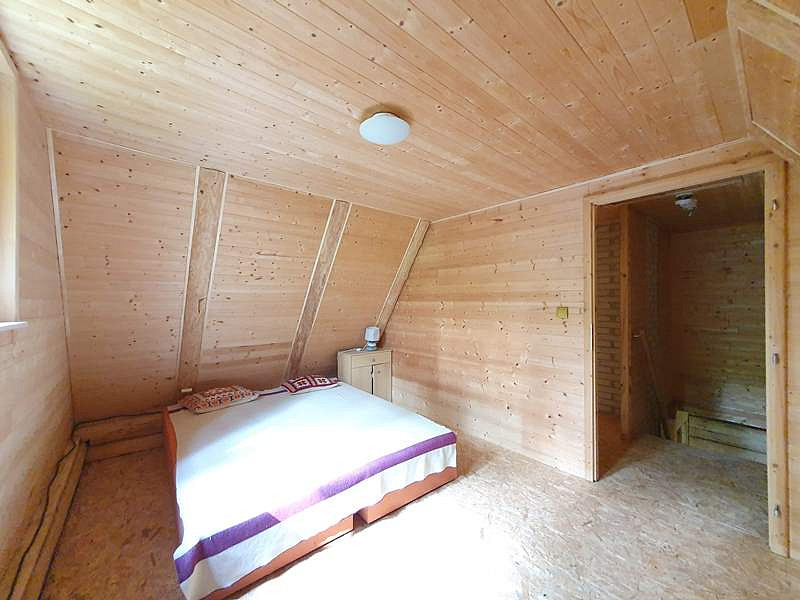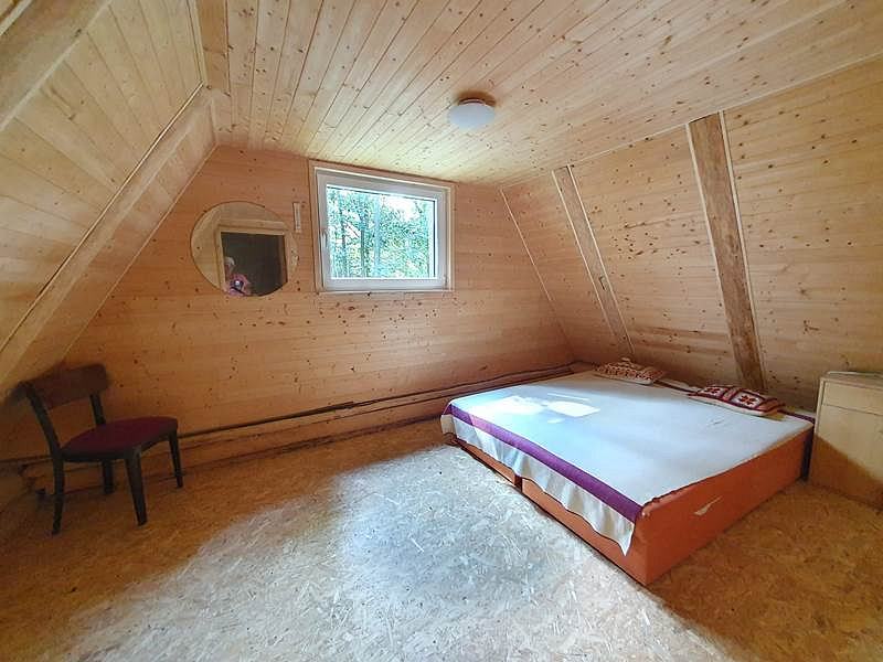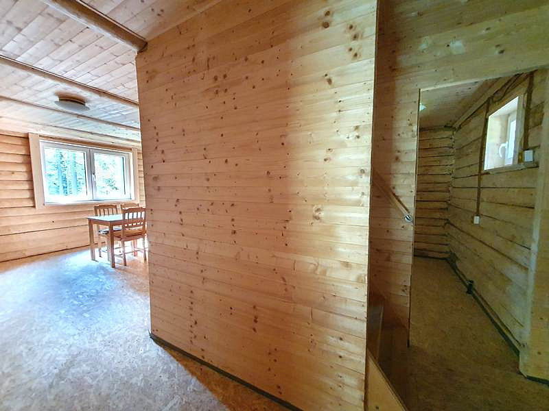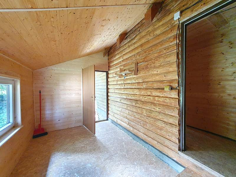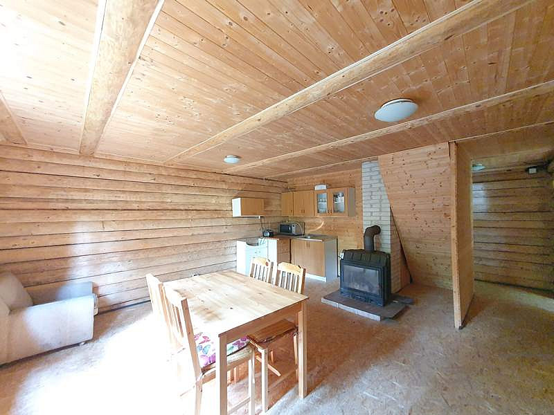 V přízemí chaty je vstupní veranda, chodbička se schodištěm do podkroví, menší místnost vhodná k vybudování sociálního zázemí a velká obytná místnost s kuchyňským koutem a krbem. V podkroví jsou 2 samostatné místnosti.