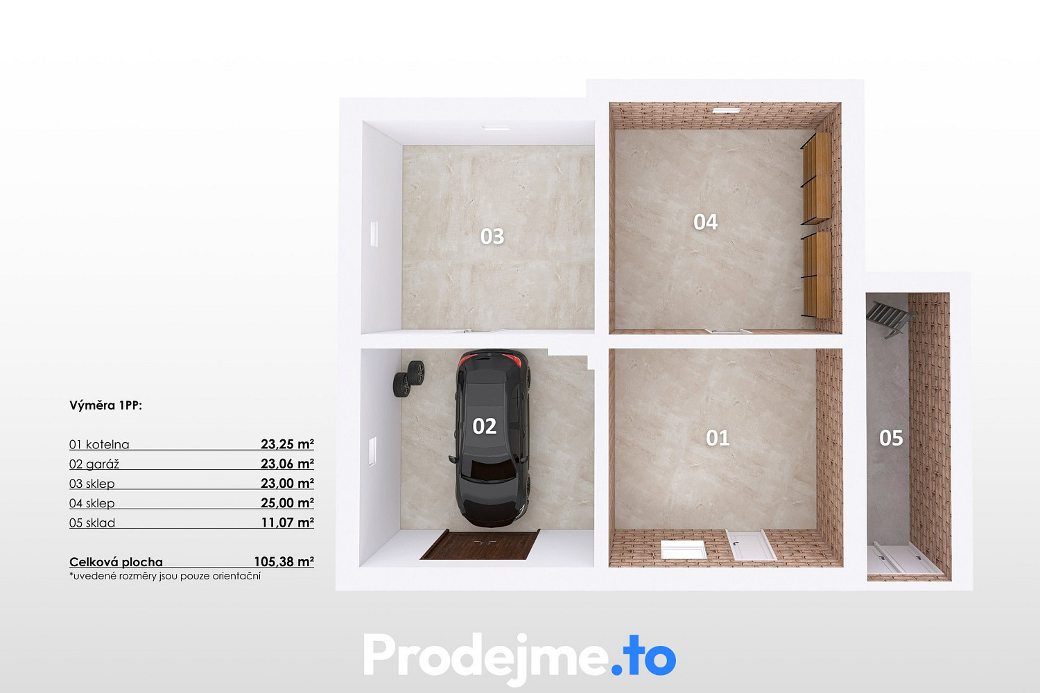 Suterén o ploše 105 m² je rozdělený na dva sklepy, kotelnu a garáž, takže tady pohodlně zaparkujete vůz a zároveň uskladníte sezónní věci, nářadí nebo cokoliv dalšího, co nechcete mít v obytné části domu. Velká plocha dává prostor i pro malou dílnu, sklad vína nebo domácí hobby zázemí.