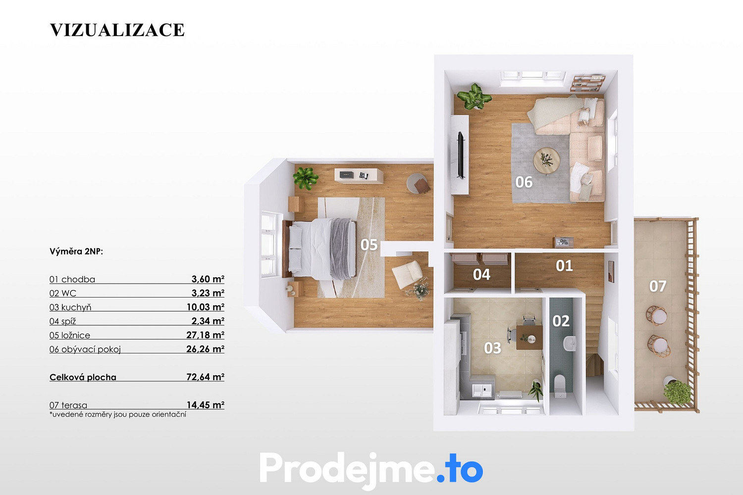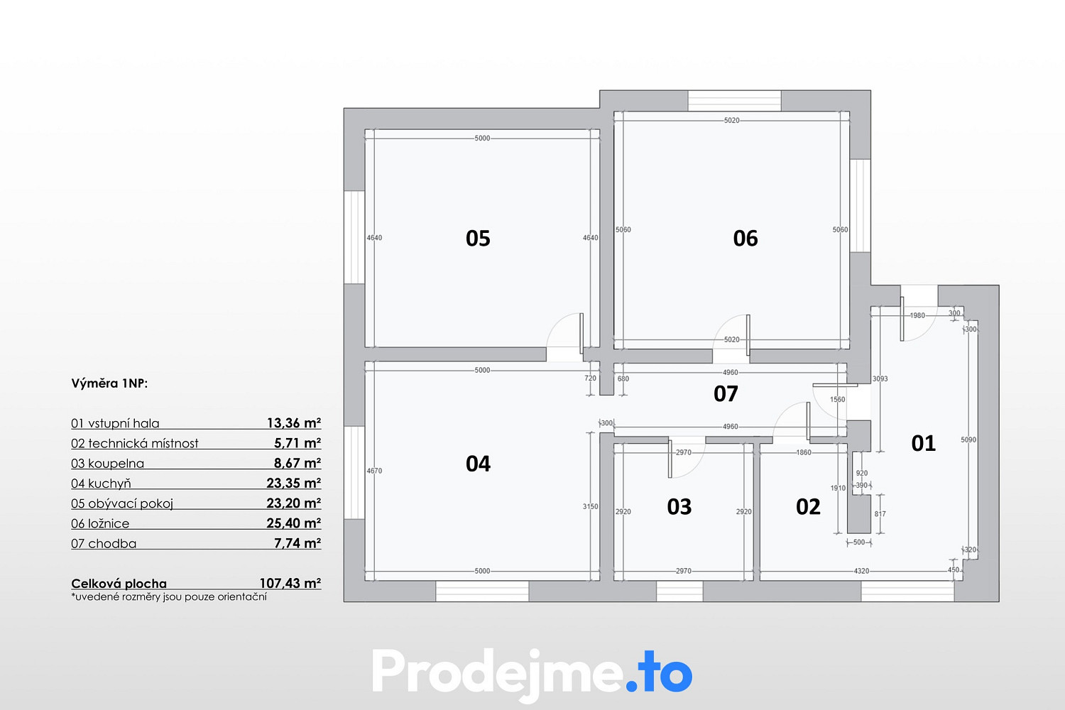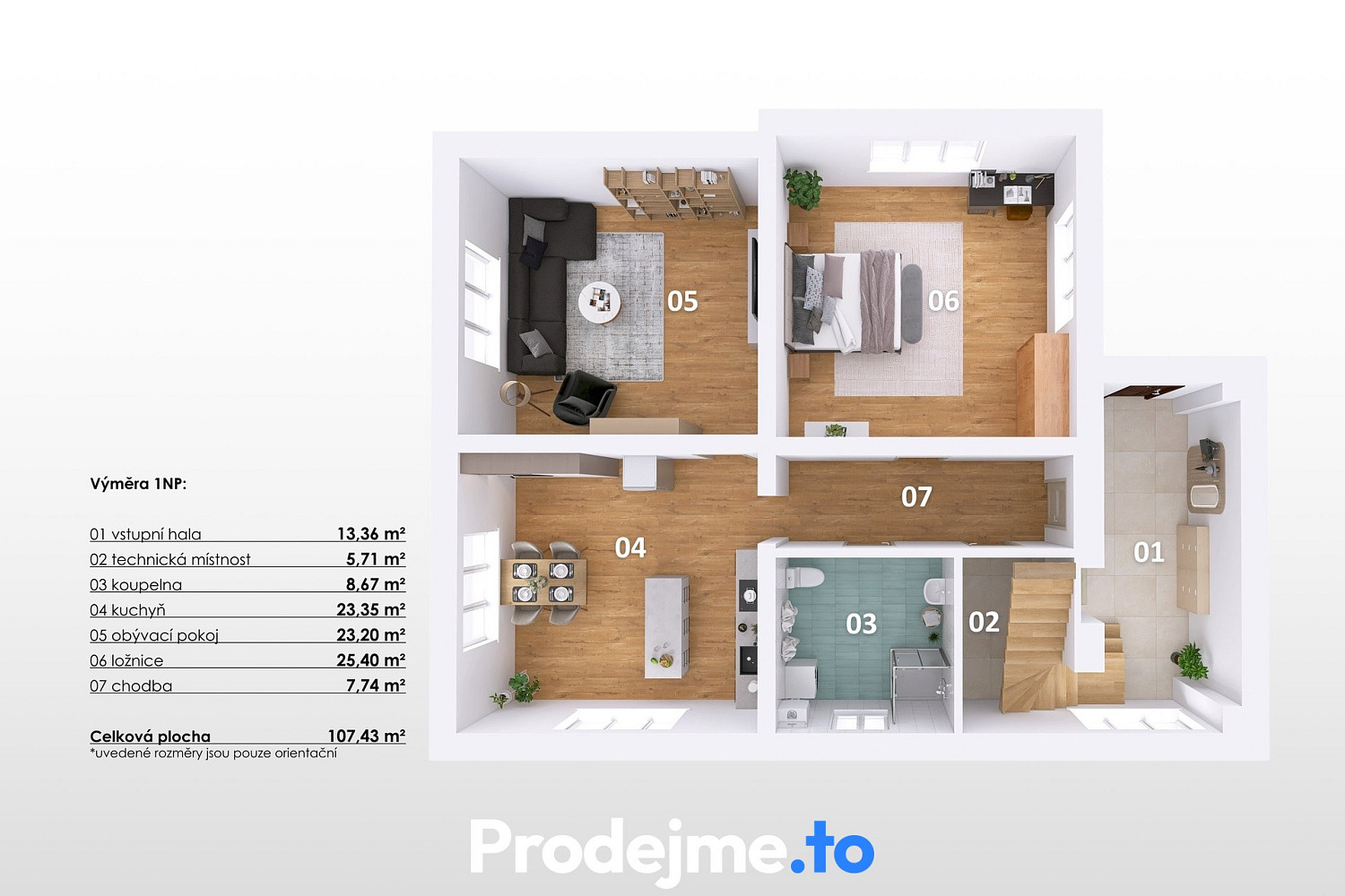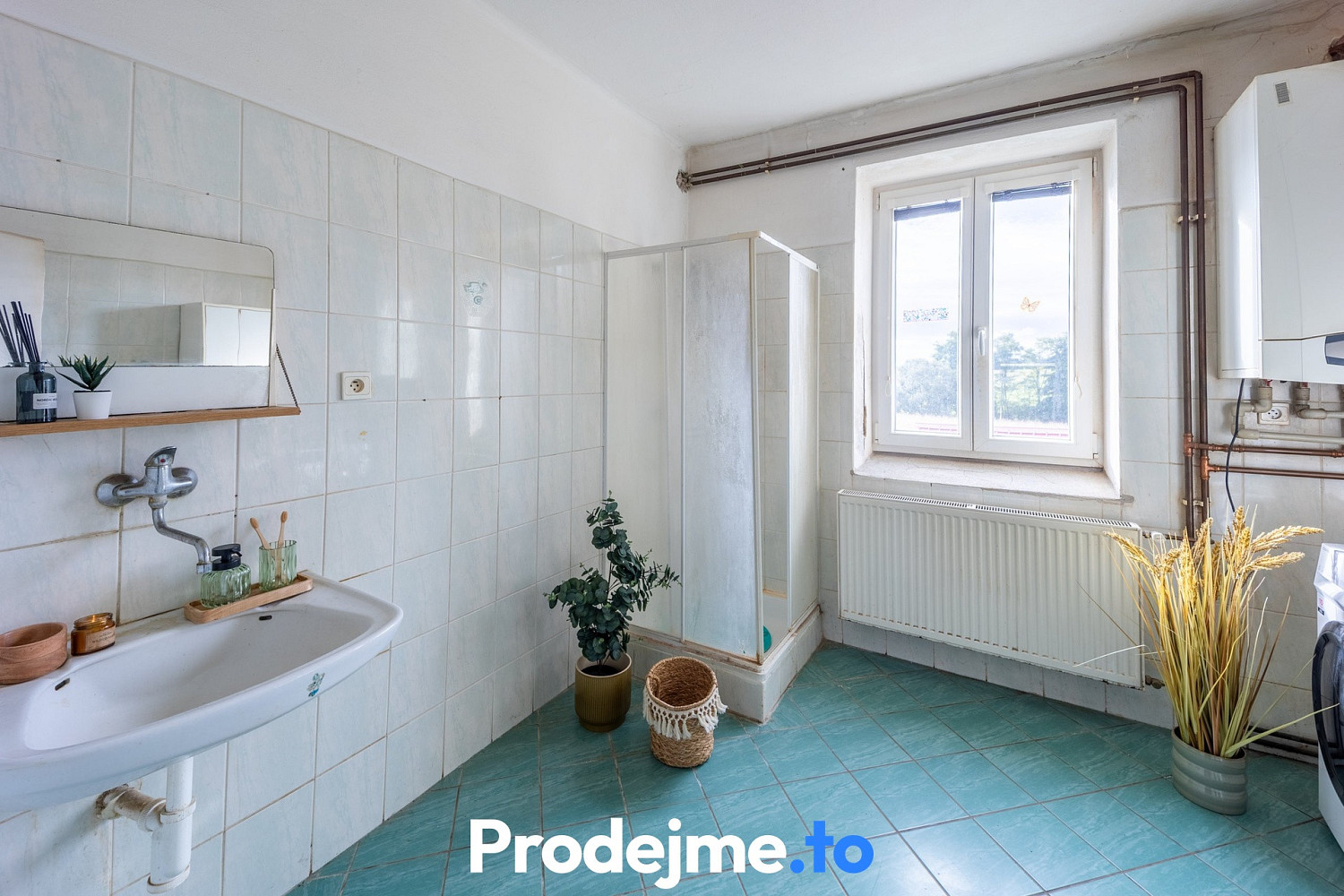První nadzemní podlaží má aktuální dispozici 2+1 se 107 m² obytné plochy. Najdete zde prostornou kuchyni s jídelním koutem, obývací pokoj, ložnici, velkorysou vstupní chodbu, technickou místnost a koupelnu se sprchou a toaletou. Prostor je plně obyvatelný už nyní, ale zároveň poskytuje skvělý základ pro budoucí modernizaci.