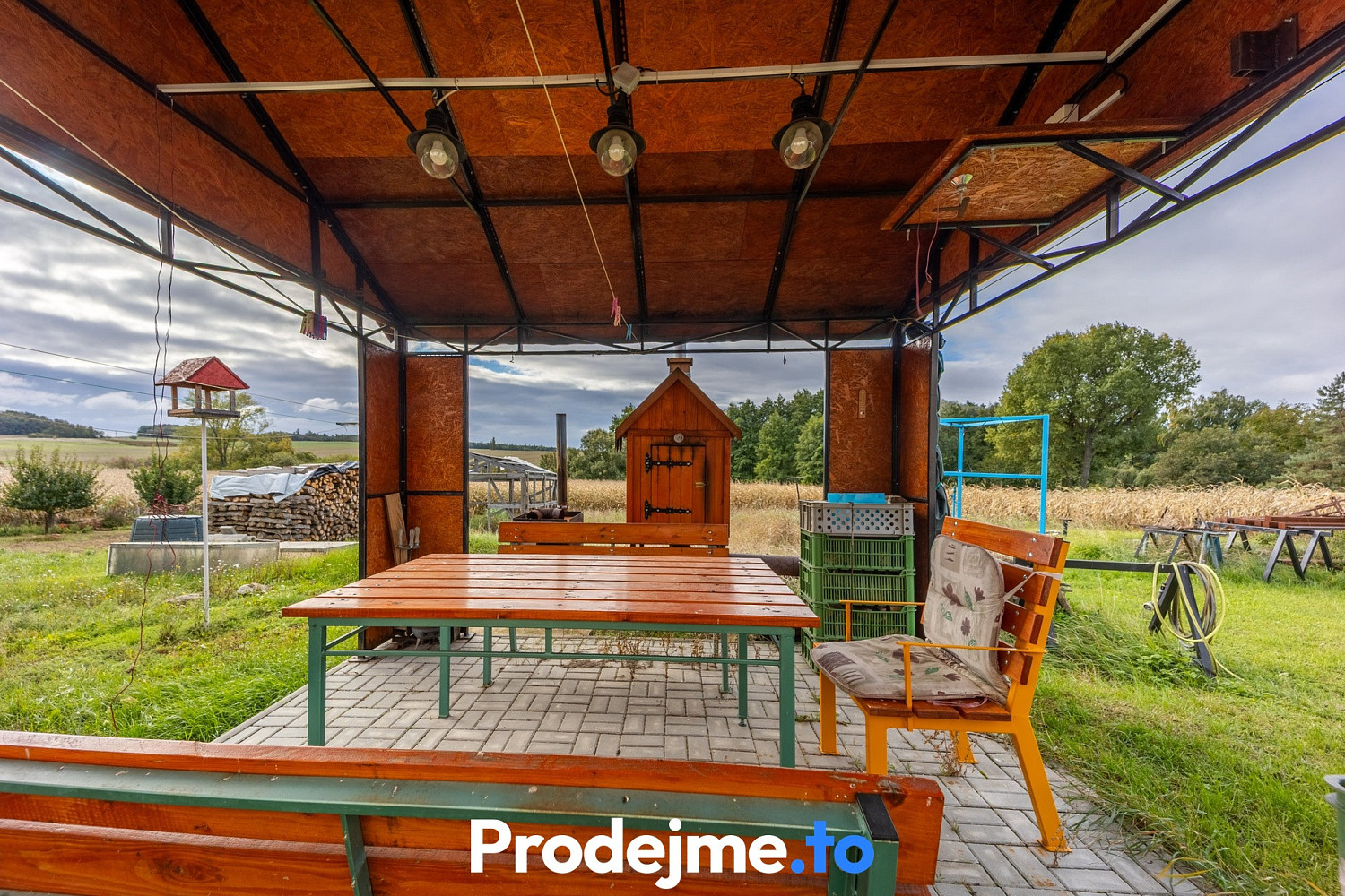 Součástí nemovitosti je také rozsáhlý pozemek o celkové ploše 1 800 m². Aktuálně není oplocený a je rozdělený na dvě části - přední část o 800 m², která zahrnuje dům se zahradou, a zadní část tvořenou 1 000 m² orné půdy, navazující přímo za zahradou.
