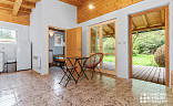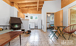 Vnitřní prostor je rozdělen na hlavní obývací pokoj spolu s kuchyňským koutem a samostatným pokojem s patrovou postelí (pro 3 osoby). Pokud plánujete větší návštěvu, v obývacím pokoji můžete využít rozkládací pohovku.