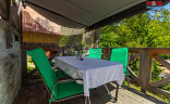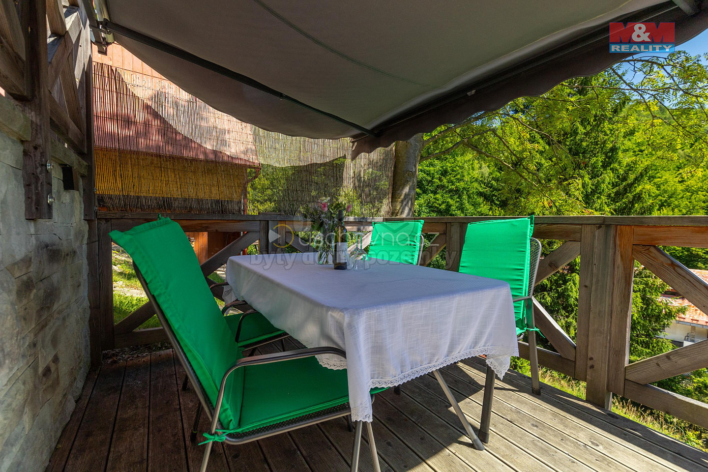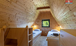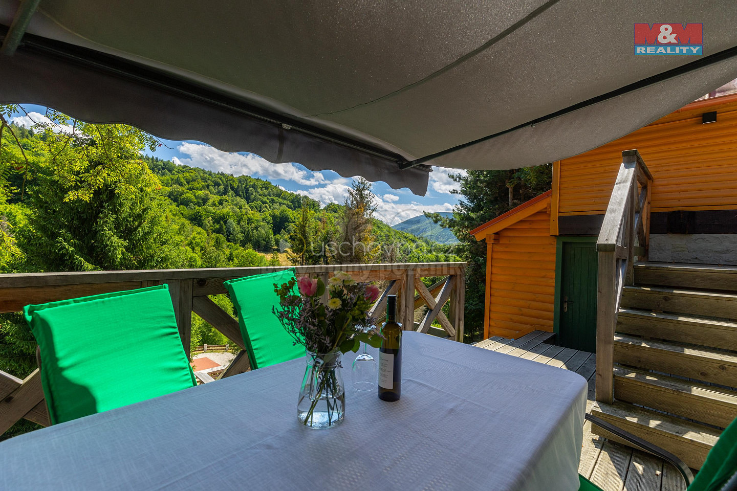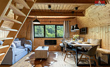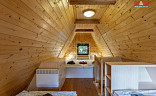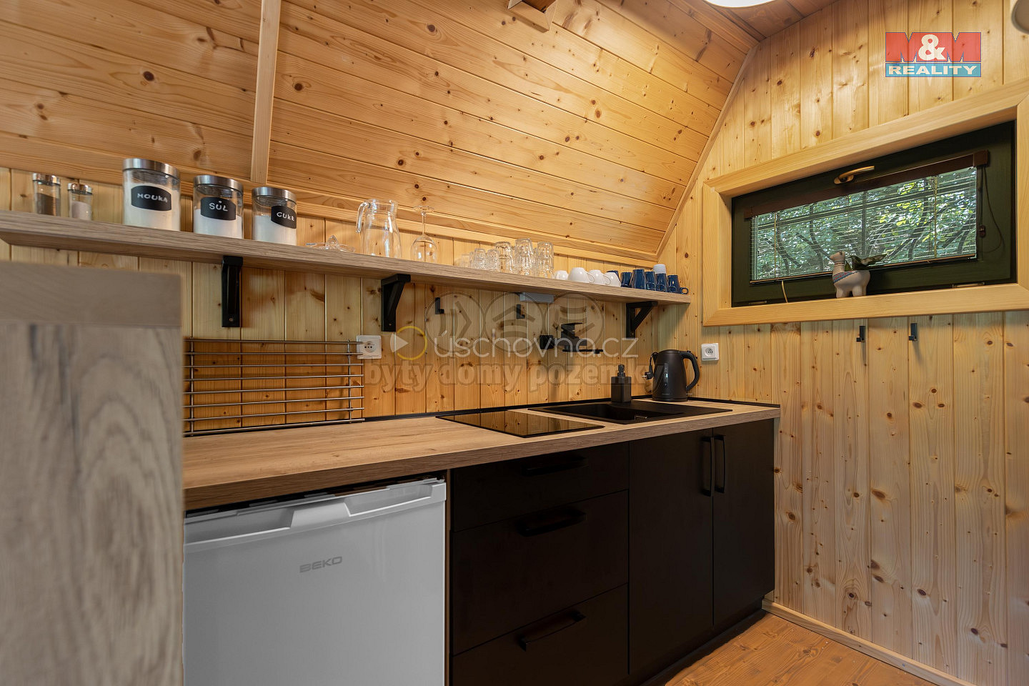 Vstupem do chaty je malá chodba s vestavěnou skříní, dále je obývací pokoj s infrapanelem k vytápění, kuchyňka s indukcí, lednicí, kávovarem, mikrovlnou troubou, rychlovarnou konvicí a veškerým kuch. vybavením. V prvním patře se rovněž nachází sprch. kout a splachovací WC. V patře po schodech se nachází ložnice k odpočinku, kde je větší manželská postel a dvě samostatné postele. Vodné a stočné je řešeno zásobníkem přes čističku od hotelu, který je pod chatou. Odpady - kanalizace. Chata má 2 terasy, jedna zpevněná pod chatou, druhá hned vedle chaty s posezením a markízou. Chata se prodává celkově vybavená, včetně nábytku, nádobí a venkovního posezení. Tato chata je ideálním místem pro ty, kdo hledají klid a únik od ruchu města.