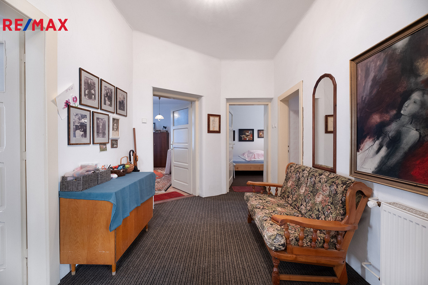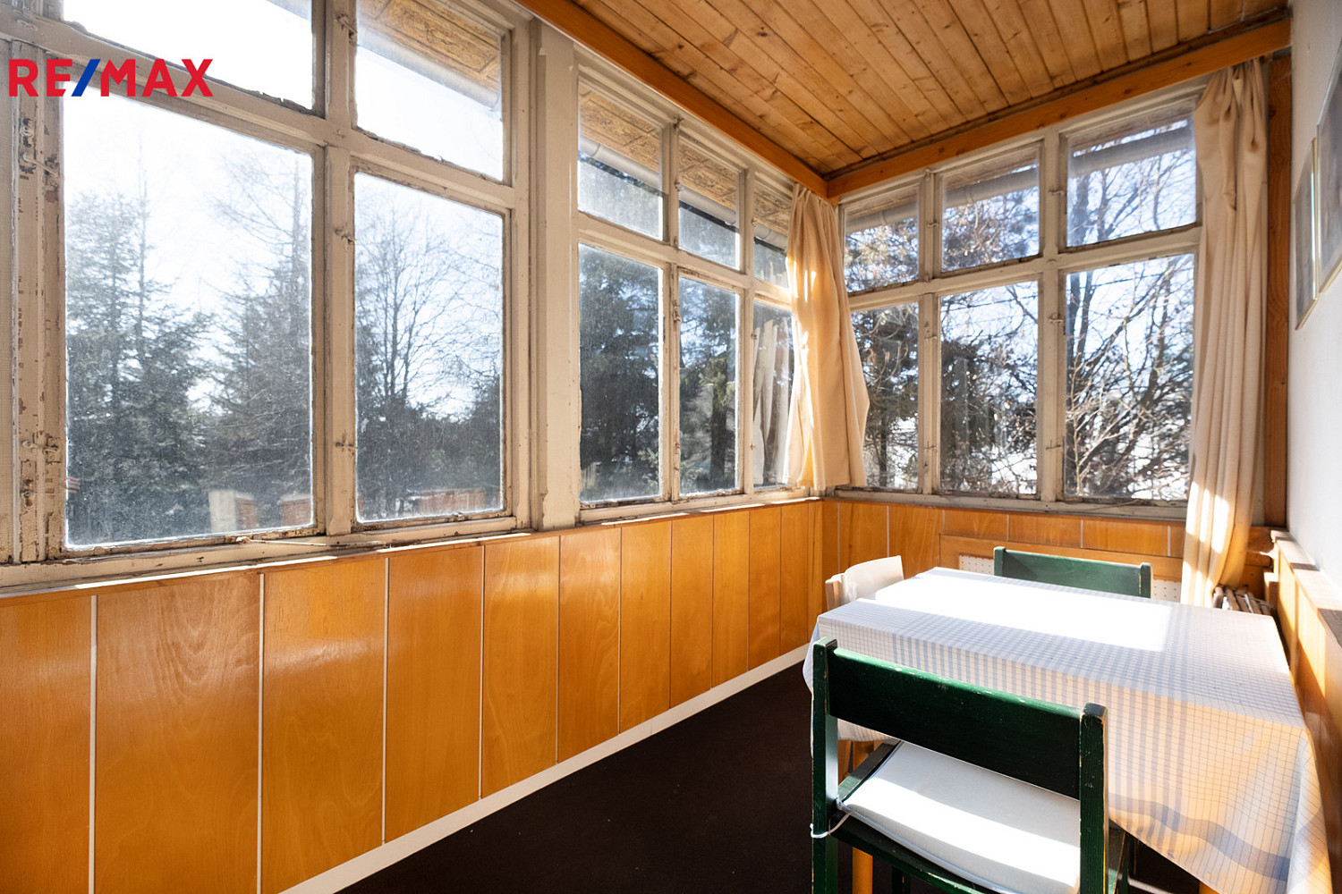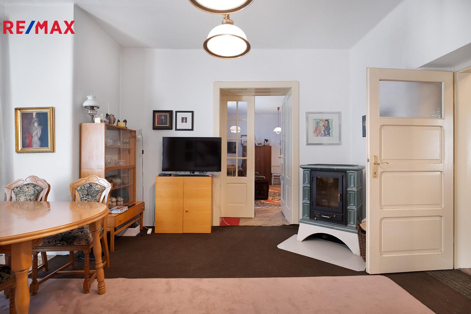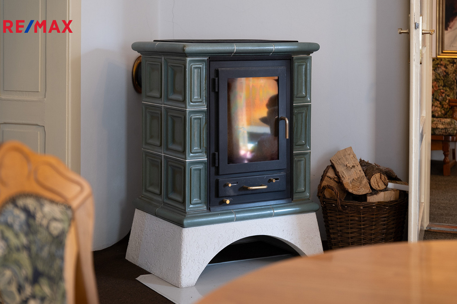 V přízemí se nachází elegantní obývací salón, jehož součástí je jídelní kout umístěný v útulném výklenku, odkud se otevírá pohled na kachlová krbová kamna – pravé srdce domova, které zve k posezení a chvílím pohody. Na obývací část plynule navazuje další prostorný pokoj, který si zachoval svůj původní šarm a lze jej využít jako pracovnu či reprezentativní salon. Další samostatný pokoj má rovněž své kouzlo.