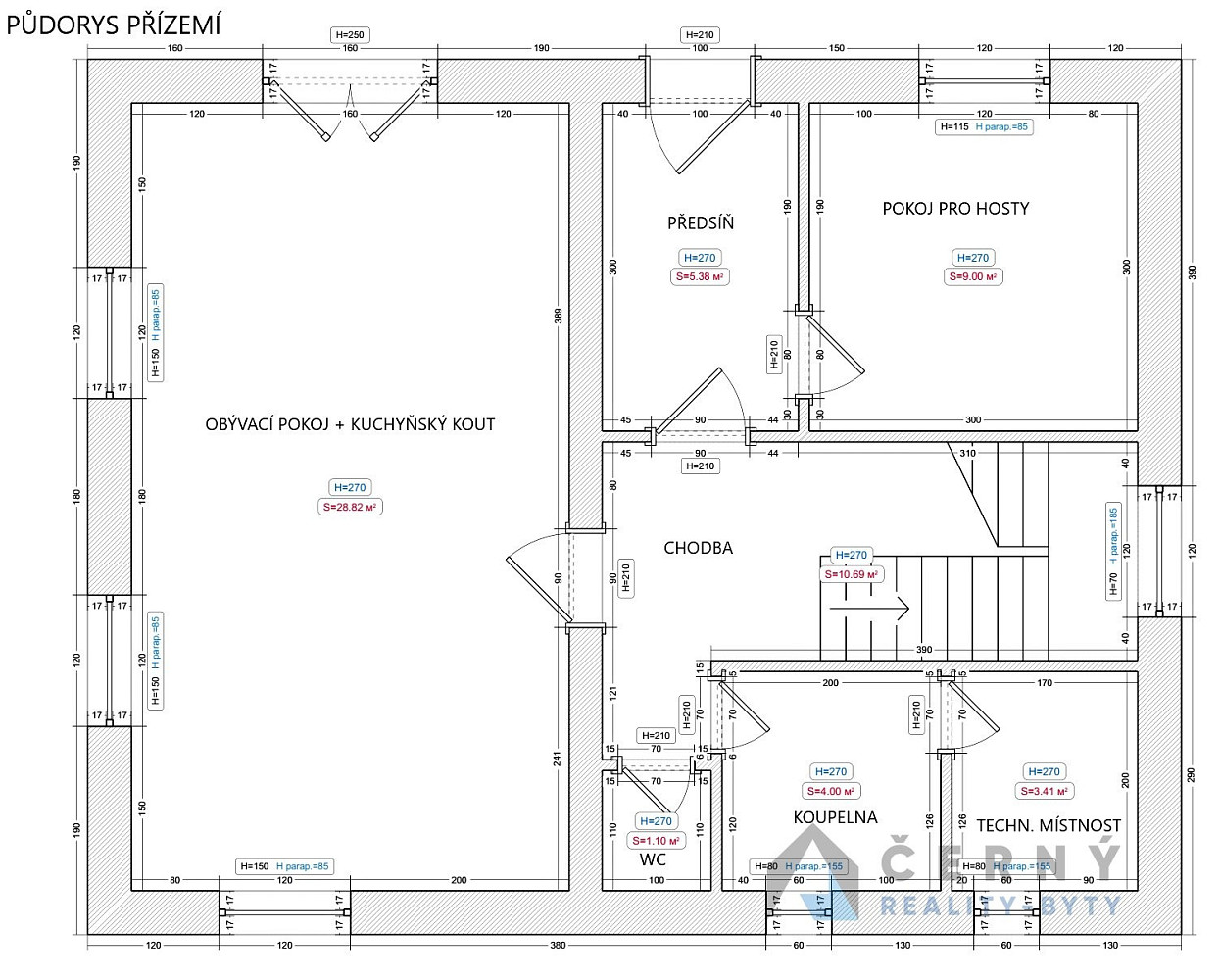 Dispozičně je řešen jako 5+kk se dvěma koupelnami a technickou místností. Užitná plocha objektu činí 153m².