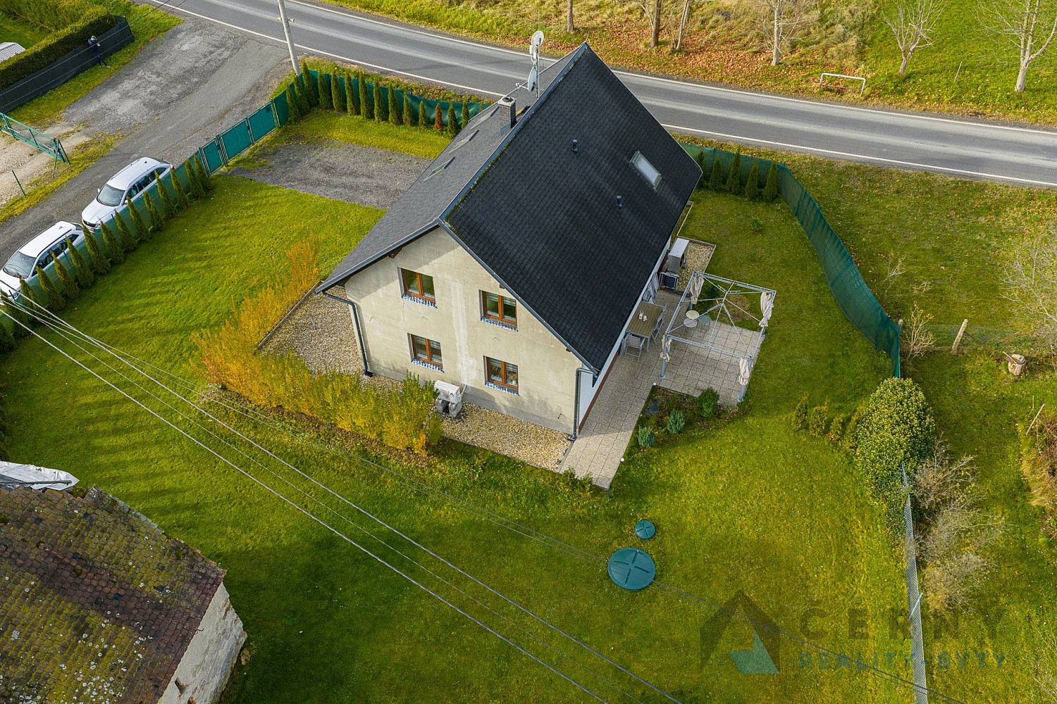 Naprosto rovinatý pozemek kolem domu je oplocený a osázený pouze trávou, takže ponechává budoucímu majiteli možnost vytvořit si zahradu podle svých představ.