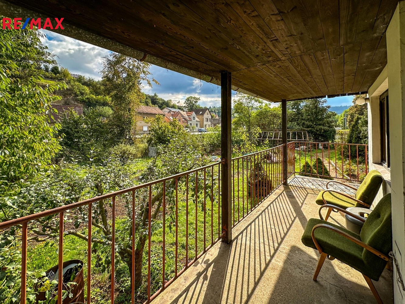Na udržované zahradě jsou vzrostlé ovocné stromy a keře.
