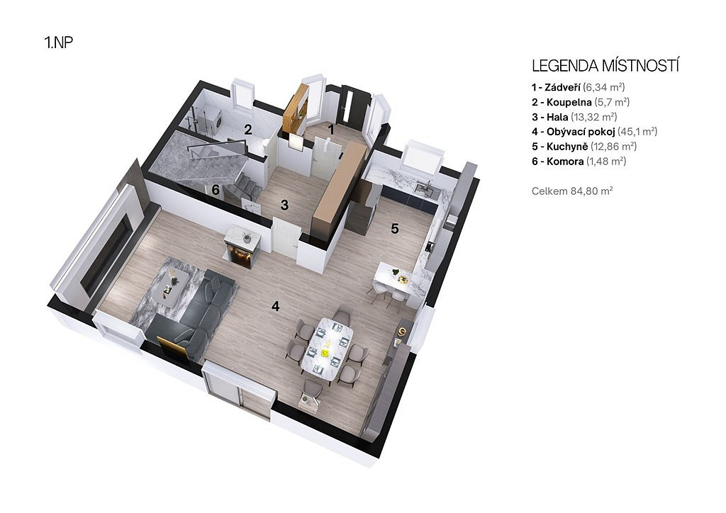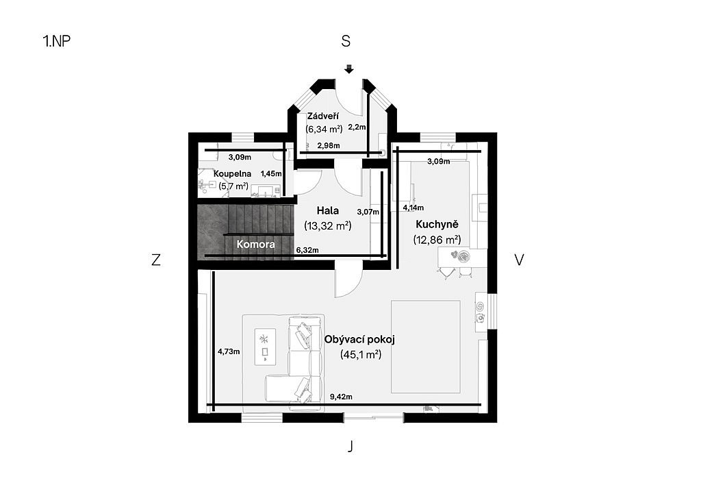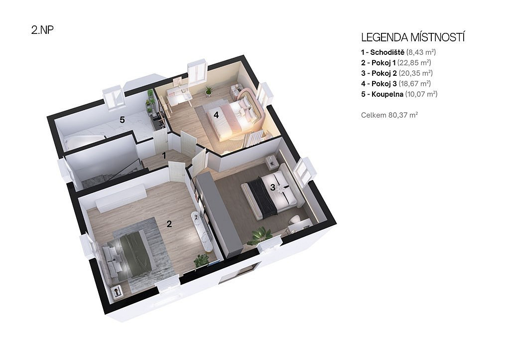 Dům o užitné ploše 165 m² je dvoupodlažní, zděný, s novou (z června roku 2025) sedlovou střechou. Vnější vzhled domu je v přírodních tónech – fasáda v teplé cihlové barvě, tmavá střecha a okna s dekorem dřeva. Přízemí domu nabízí vstupní zádveří, chodbu, koupelnu se sprchovým koutem a WC, technickou místnost, a především velkorysý obývací prostor s kuchyní a jídelnou – centrální místo celého domu, odkud se vstupuje rovnou na terasu. V patře pak najdete chodbu, tři samostatné pokoje, prostornou koupelnu s vanou a WC. Z jednoho pokoje je přístup do podkroví, které může sloužit jako další úložné místo či do budoucna jako odpočinkový prostor.