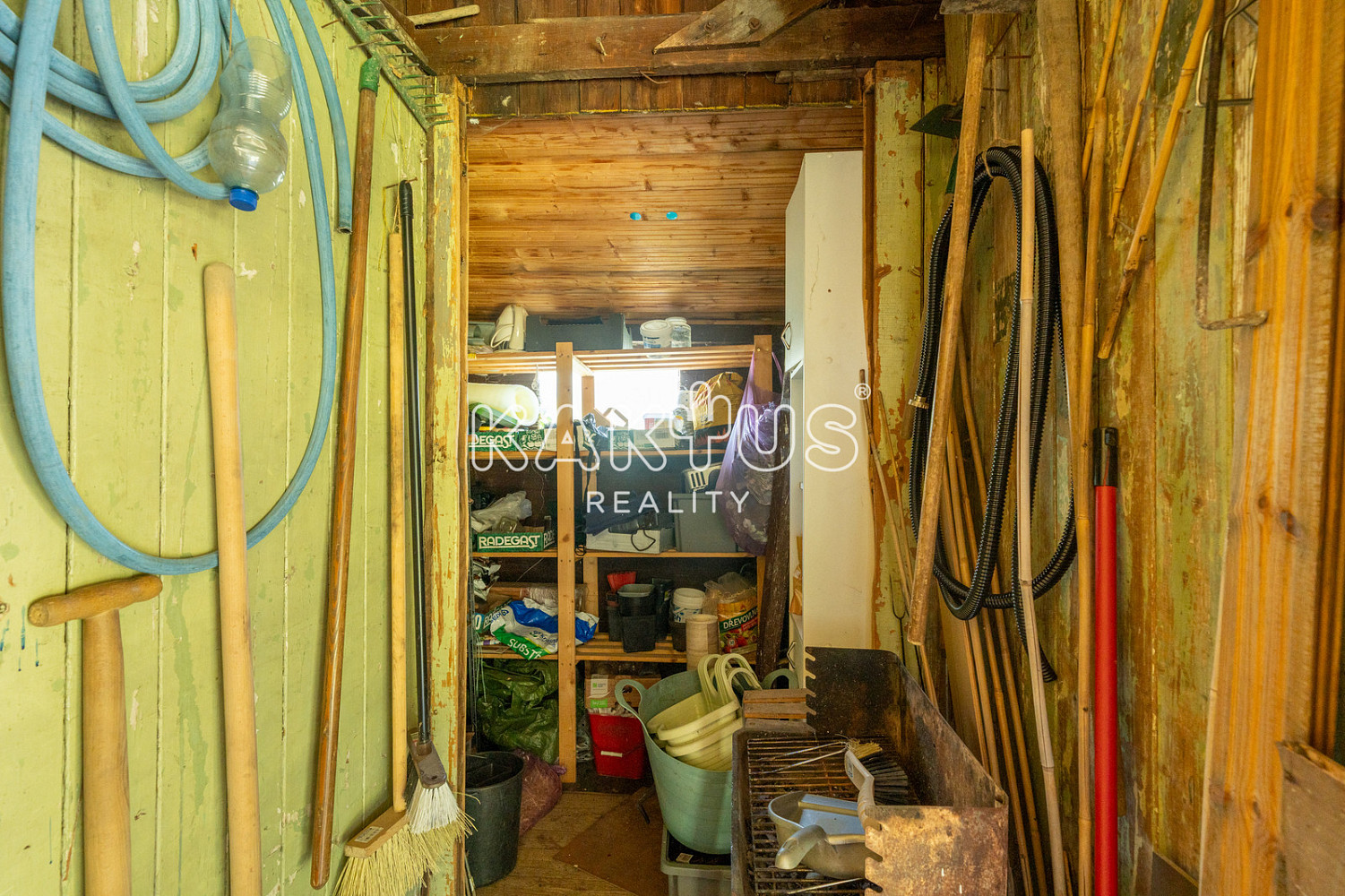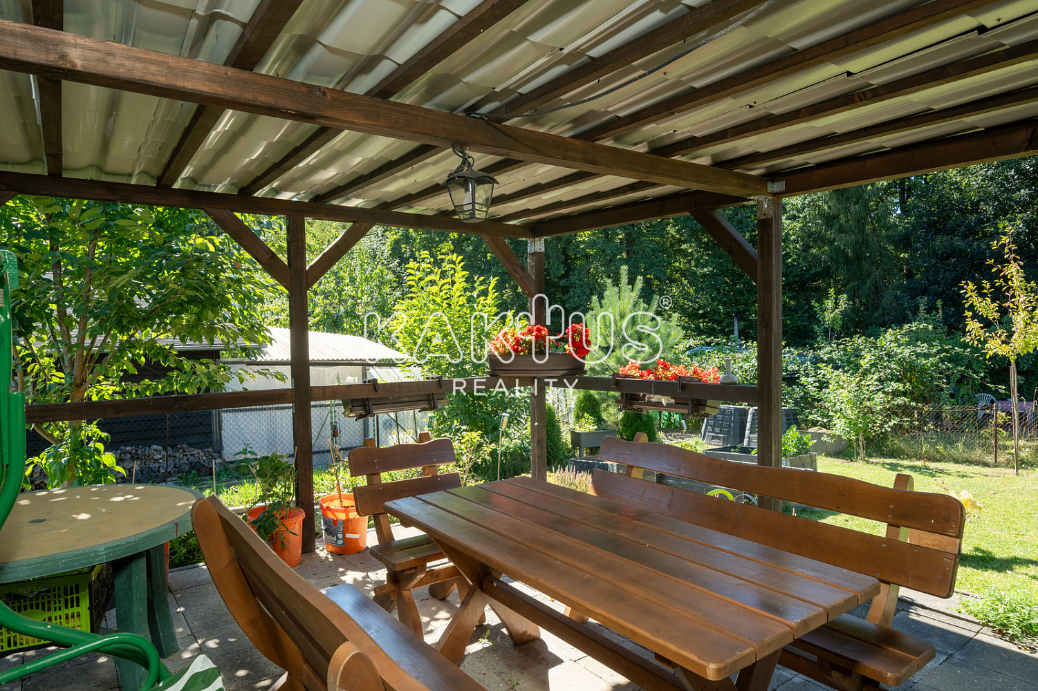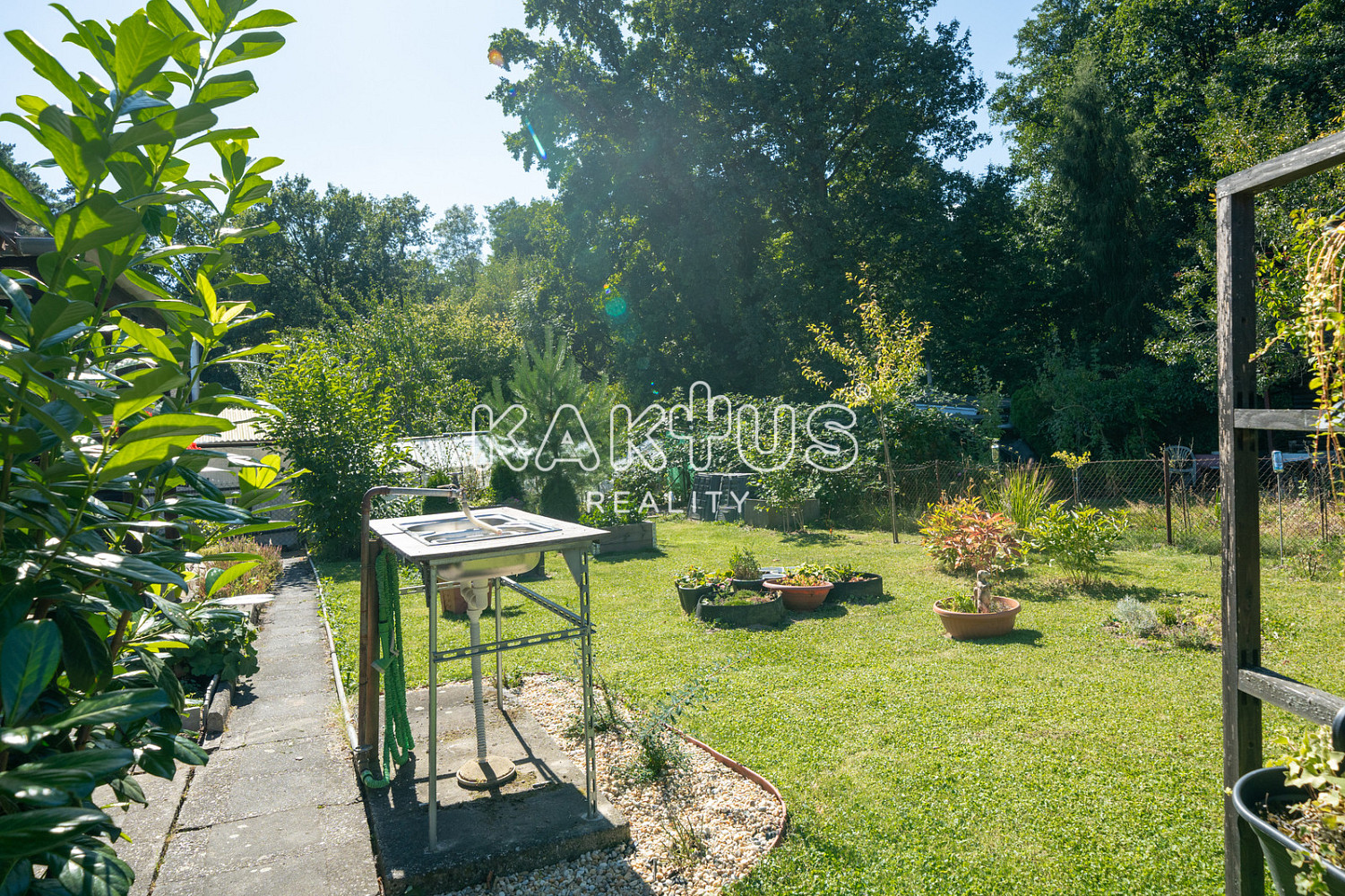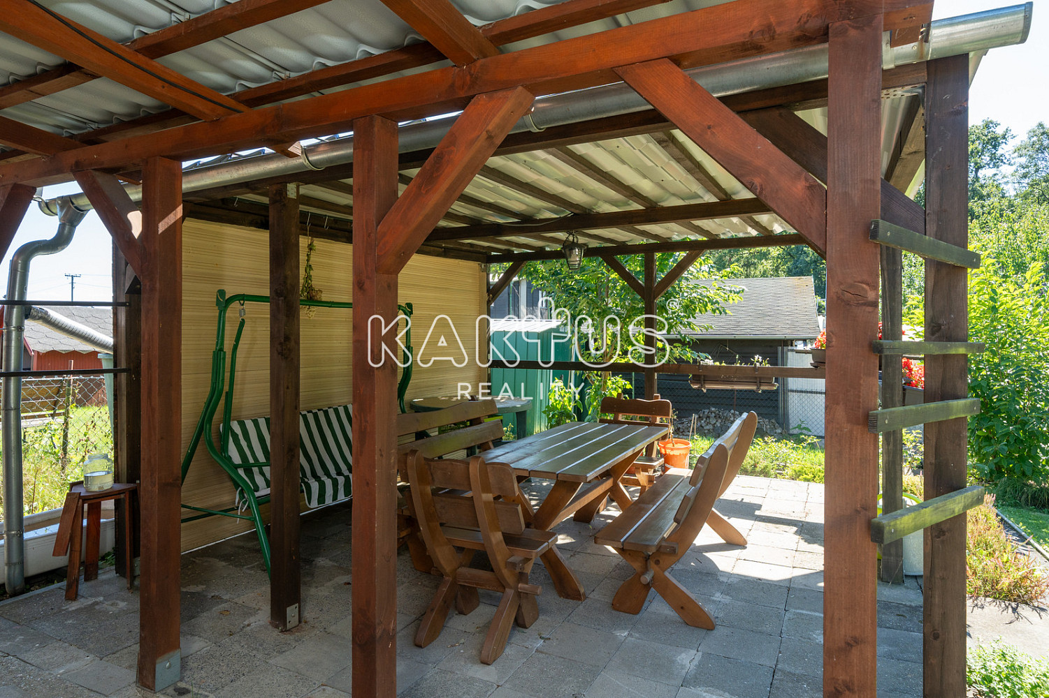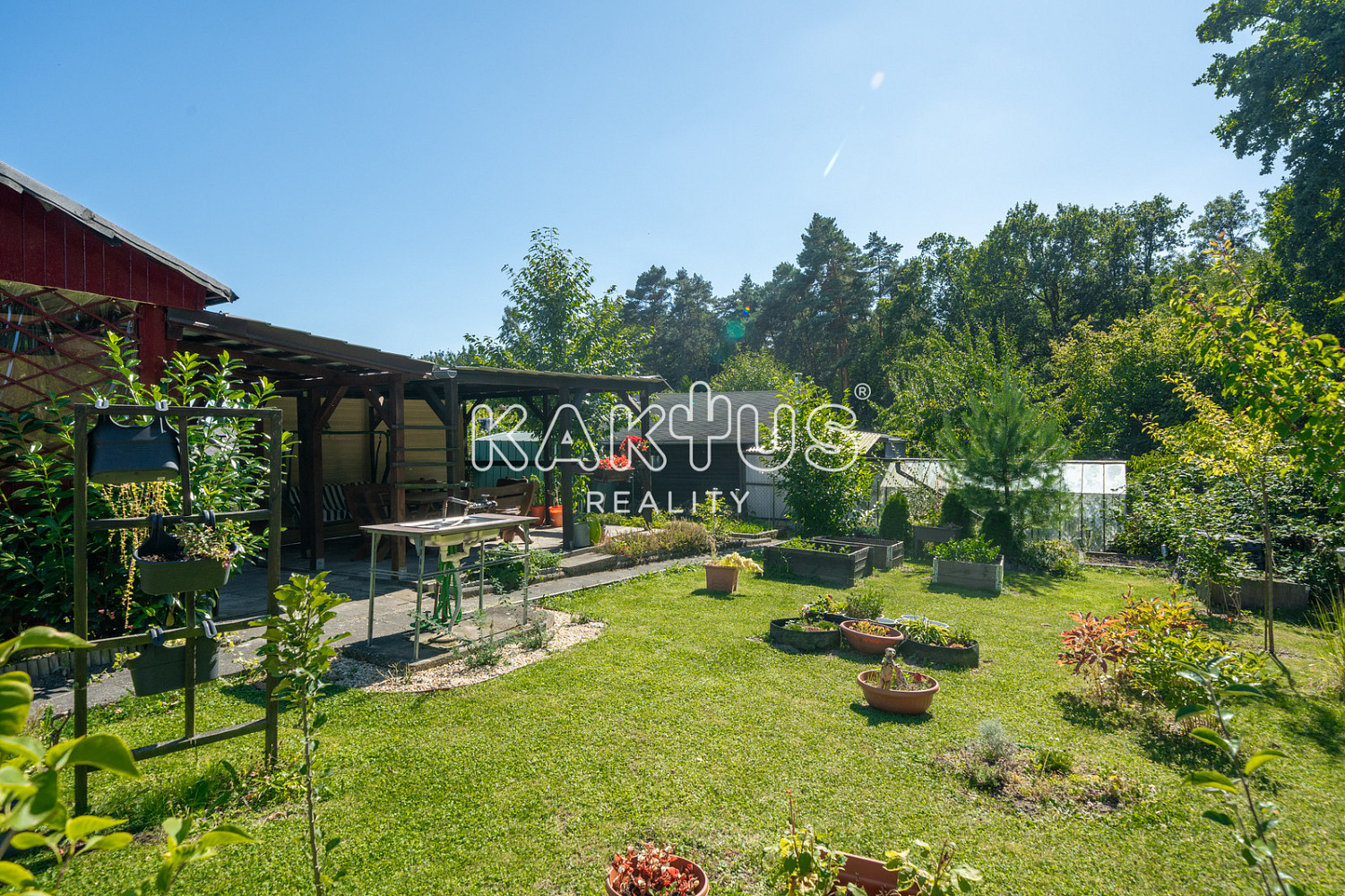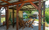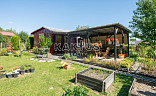 Je napojena na elektřinu, voda je přivedena až na pozemek. Součástí je pergola a menší zahradní domek s vybavením pro údržbu zahrady. Chata je vybavena chemickým záchodem.