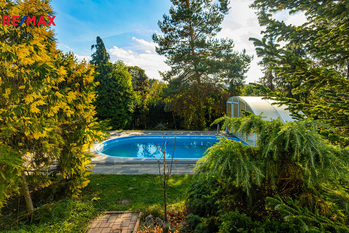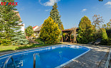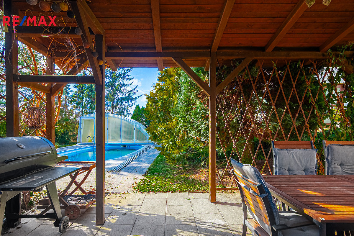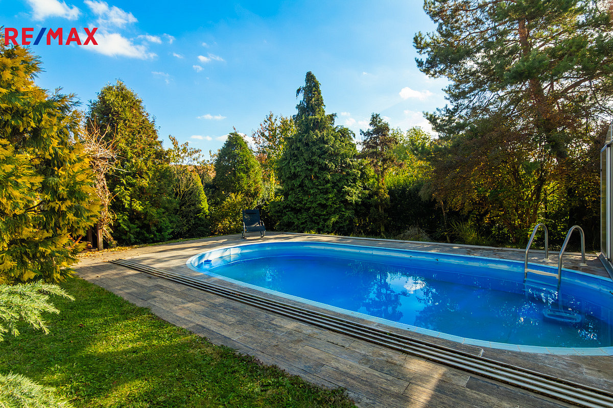 Komfort bydlení zvyšuje udržovaná zahrada s pergolou a bazénem s protiproudem. Budoucí majitel jistě ocení také skleník a kopanou studnu. Součástí objektu je vedlejší stavba o velikosti 80 m², která slouží jako garáž a zároveň nabízí dvě dílny a dvě hospodářské místnosti. Tato stavba má po celé své ploše využitelný půdní prostor a je částečně podsklepena.