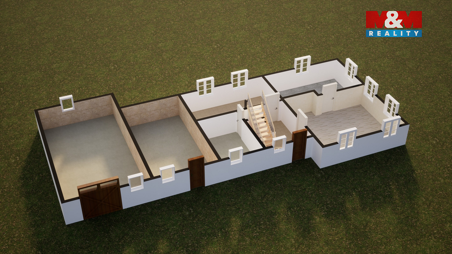 V přízemí najdete hlavní pokoj, vedlejší pokojík, kuchyni a místnost pro koupelnu. První patro vás uvítá velkou místností a přístupem na dřevěnou pavlač, která vede do dalších prostor ideálních pro budování pokojů. Půda a stodola skýtají další potenciál využití.