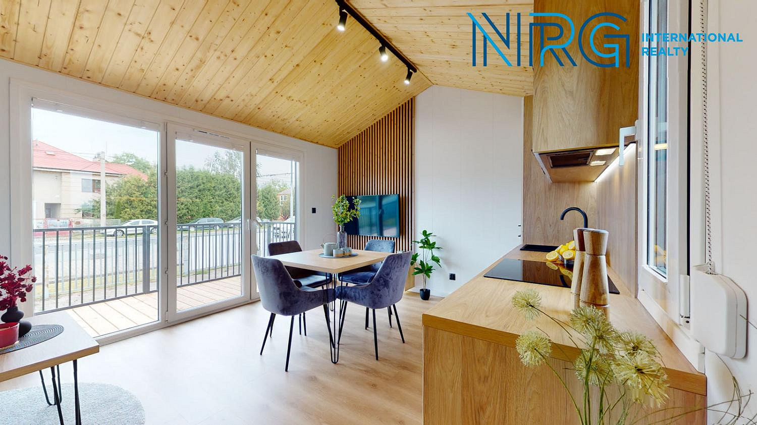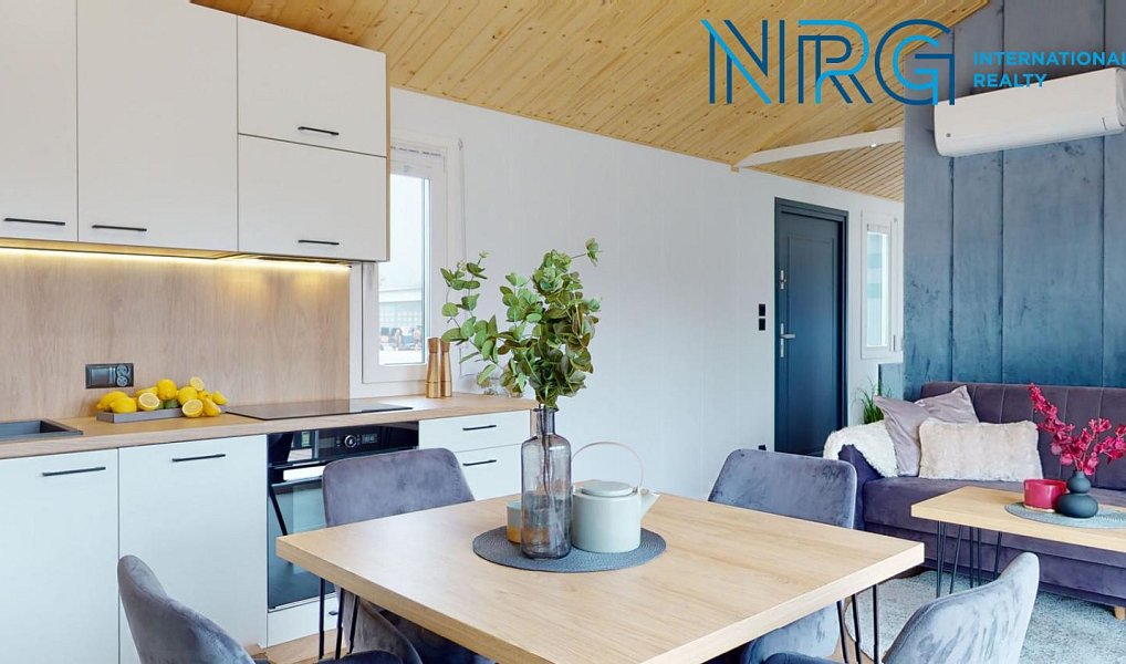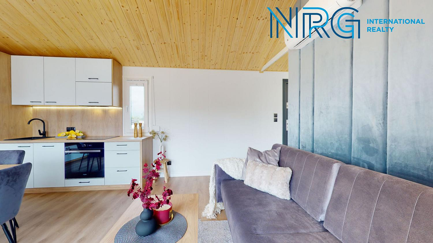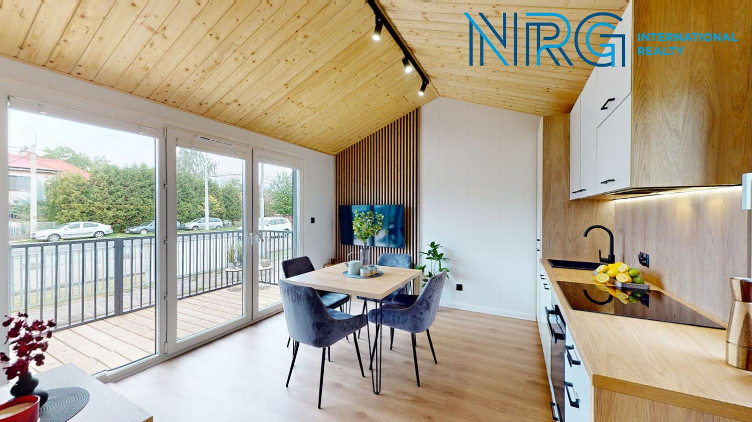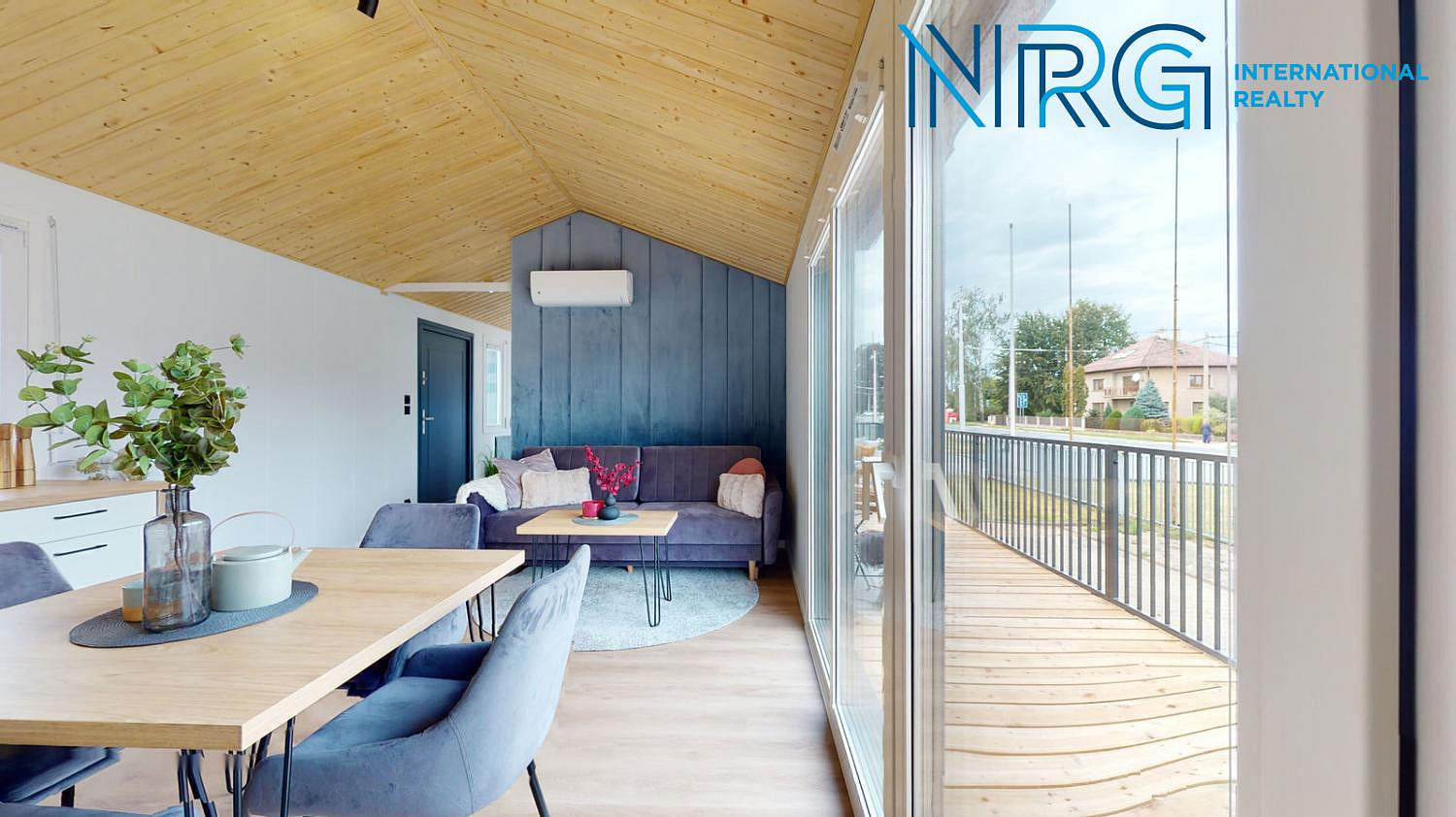 Dům o ploše 42 m², dispozičně 3+kk, ale reálně třetí místnost je velmi malá, vhodná jako šatna nebo pracovna. Je možnost malou místnost zrušit a zvětšit si obývák. V obýváku je vše otevřeno do štítu, tudíž i malému prostoru to dává dobrý pocit. Velkou výhodou je energetická nenáročnost domu. Dům má plechovou střechu, vnější obložení ze skandinávského smrku, minerální izolace ve stěnách a střeše, PUR pěna s otevřenými buňkami v podlaze, dřevěné příčky, plastová okna s dvojskly, vinylová podlaha. Vše je nové. V domě ještě nikdo nebydlel. Kuchyň je vybavená myčkou, ledničkou a malým mrazákem. Stěhování je možné cca v létě 2024. Foto je ze vzorového domu, v ceně tohoto domu není terasa, klimatizace a venkovní rolety. Vše je možné dodělat. Potřebné investice jsou přípojku kanalizace, která se nachází před pozemkem a vrt na studnu.