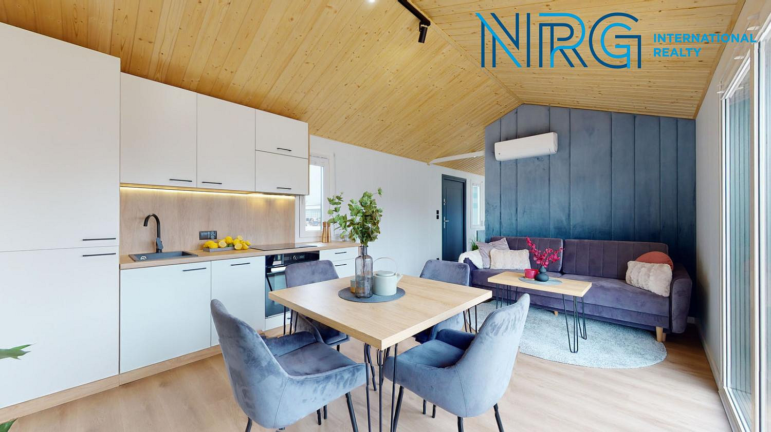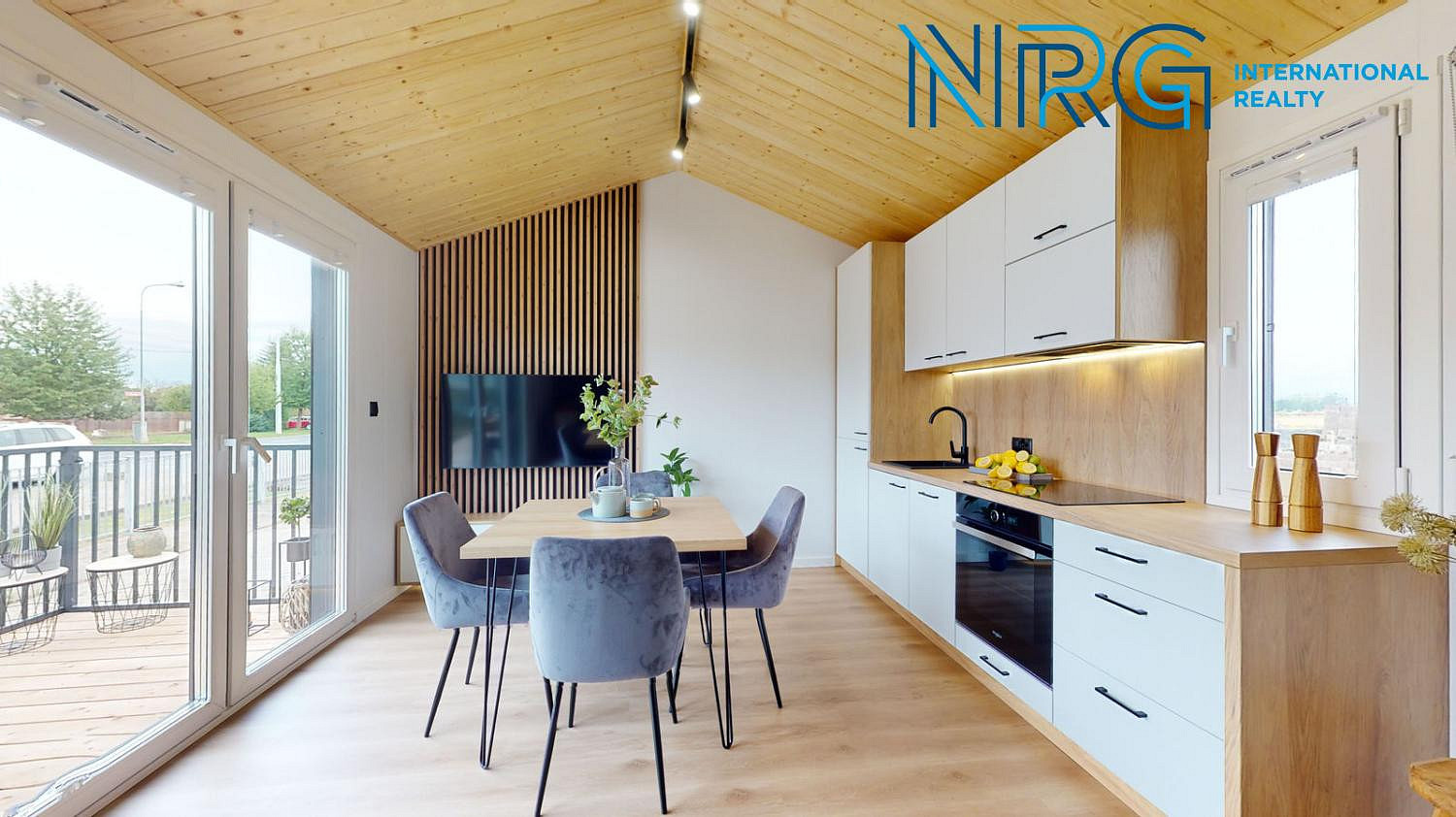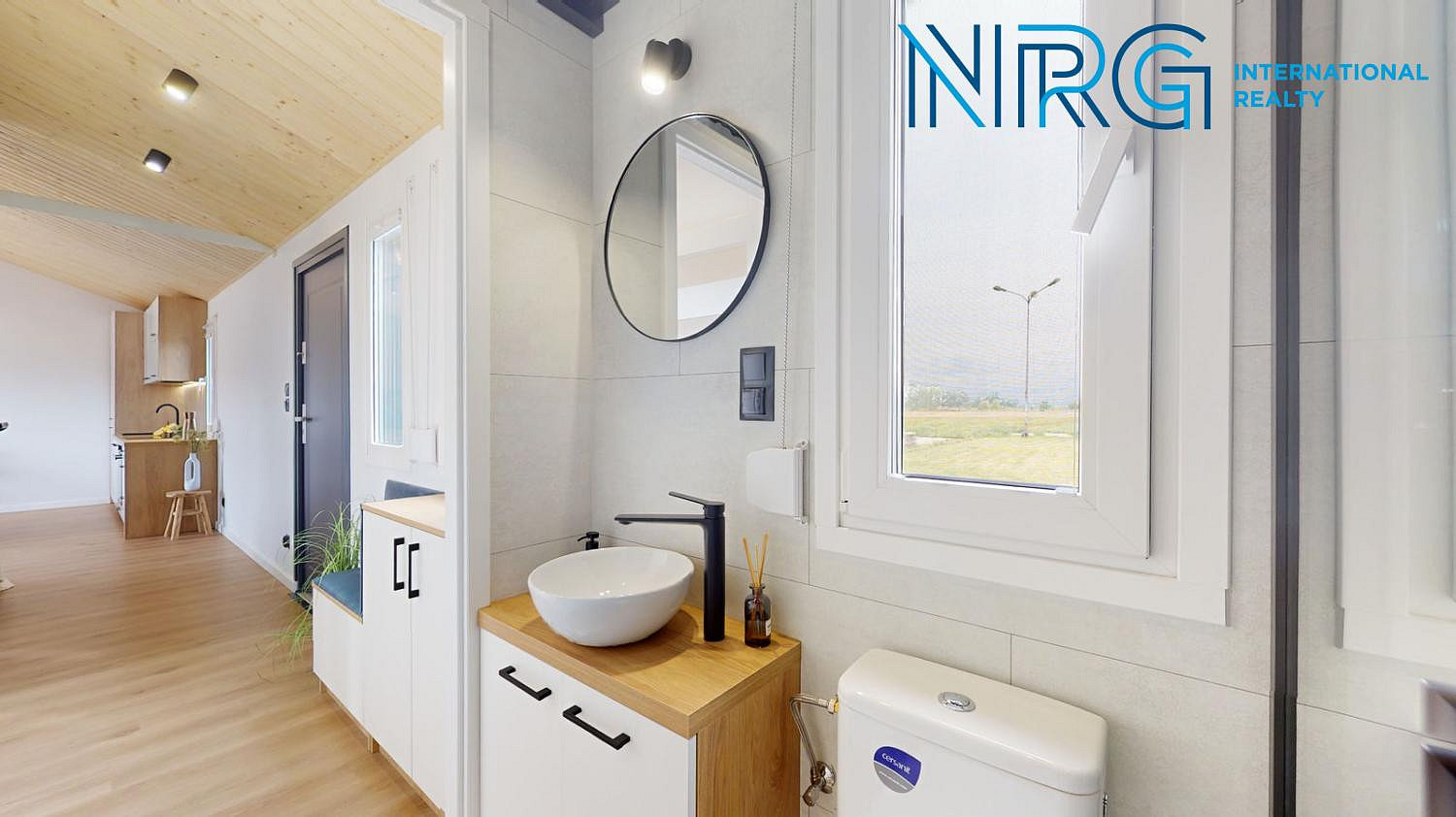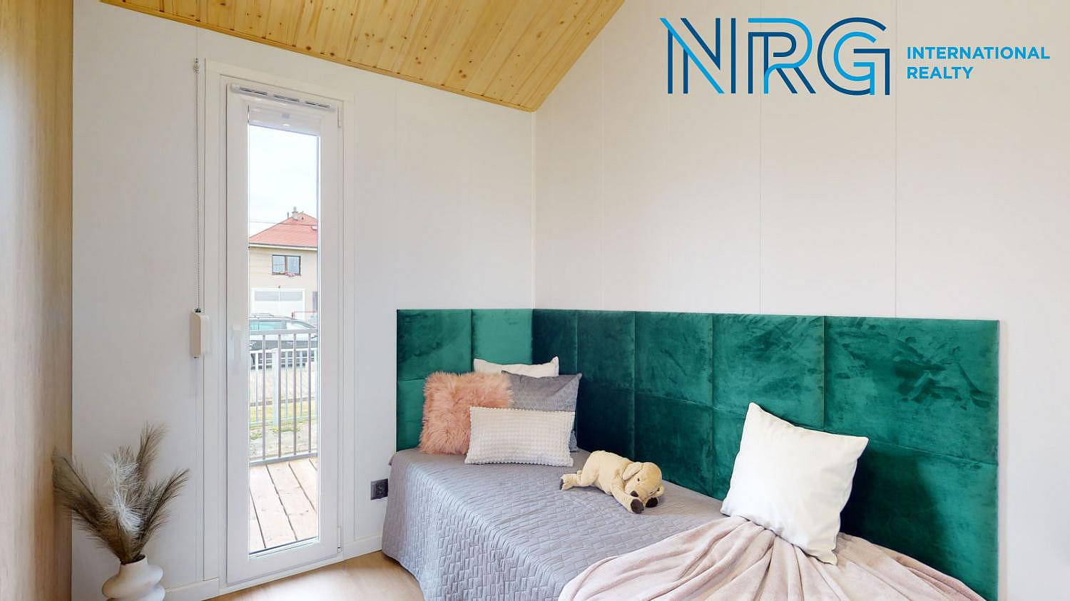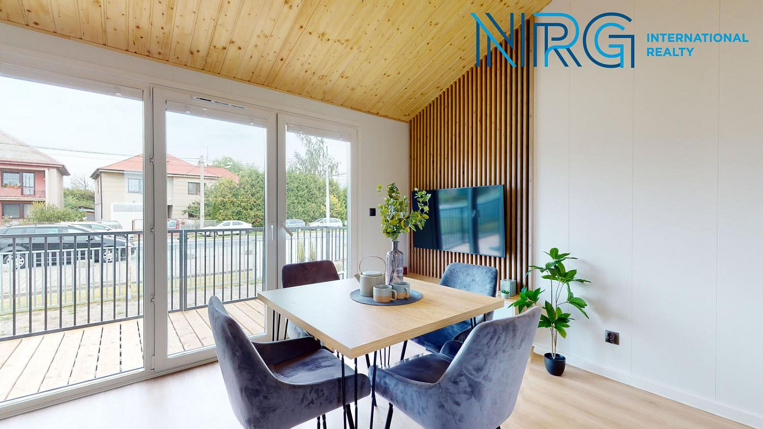 Dům o ploše 42 m², dispozičně 3+kk, ale reálně třetí místnost je velmi malá, vhodná jako šatna nebo pracovna. Je možnost malou místnost zrušit a zvětšit si obývák. V obýváku je vše otevřeno do štítu, tudíž i malému prostoru to dává dobrý pocit. Velkou výhodou je energetická nenáročnost domu. Dům má plechovou střechu, vnější obložení ze skandinávského smrku, minerální izolace ve stěnách a střeše, PUR pěna s otevřenými buňkami v podlaze, dřevěné příčky, plastová okna s dvojskly, vinylová podlaha. Vše je nové. V domě ještě nikdo nebydlel. Kuchyň je vybavená myčkou, ledničkou a malým mrazákem. Stěhování je možné cca v létě 2024. Foto je ze vzorového domu, v ceně tohoto domu není terasa, klimatizace a venkovní rolety. Vše je možné dodělat. Potřebné investice jsou přípojku kanalizace, která se nachází před pozemkem a vrt na studnu.