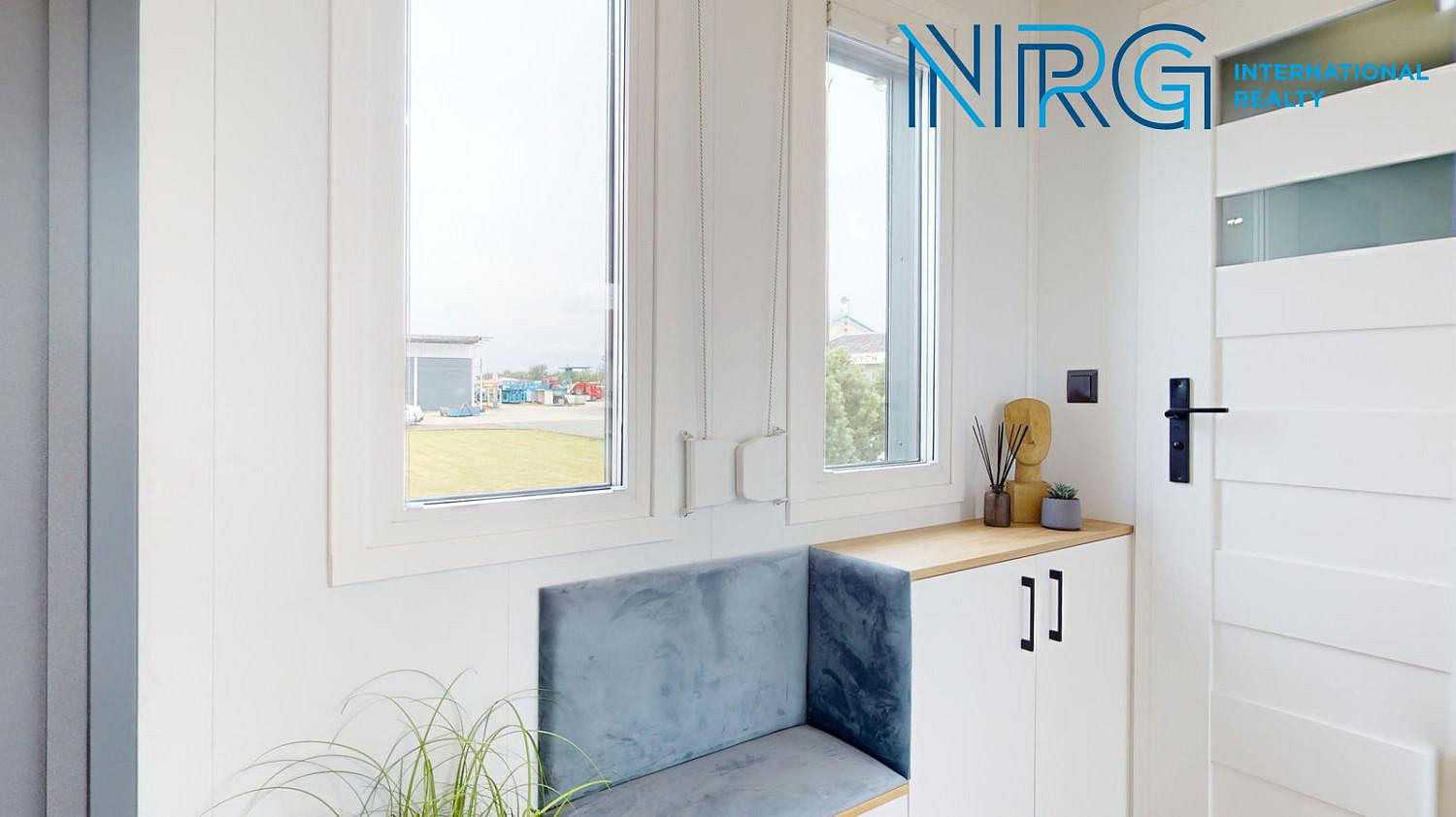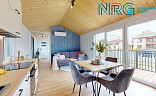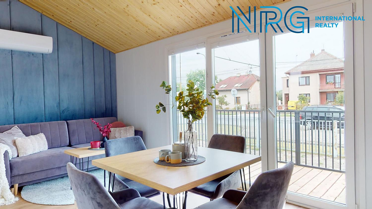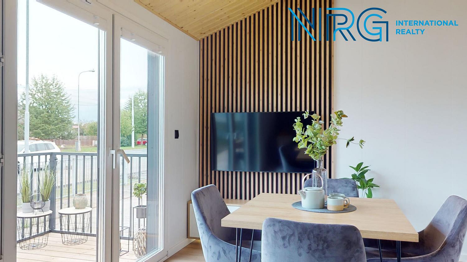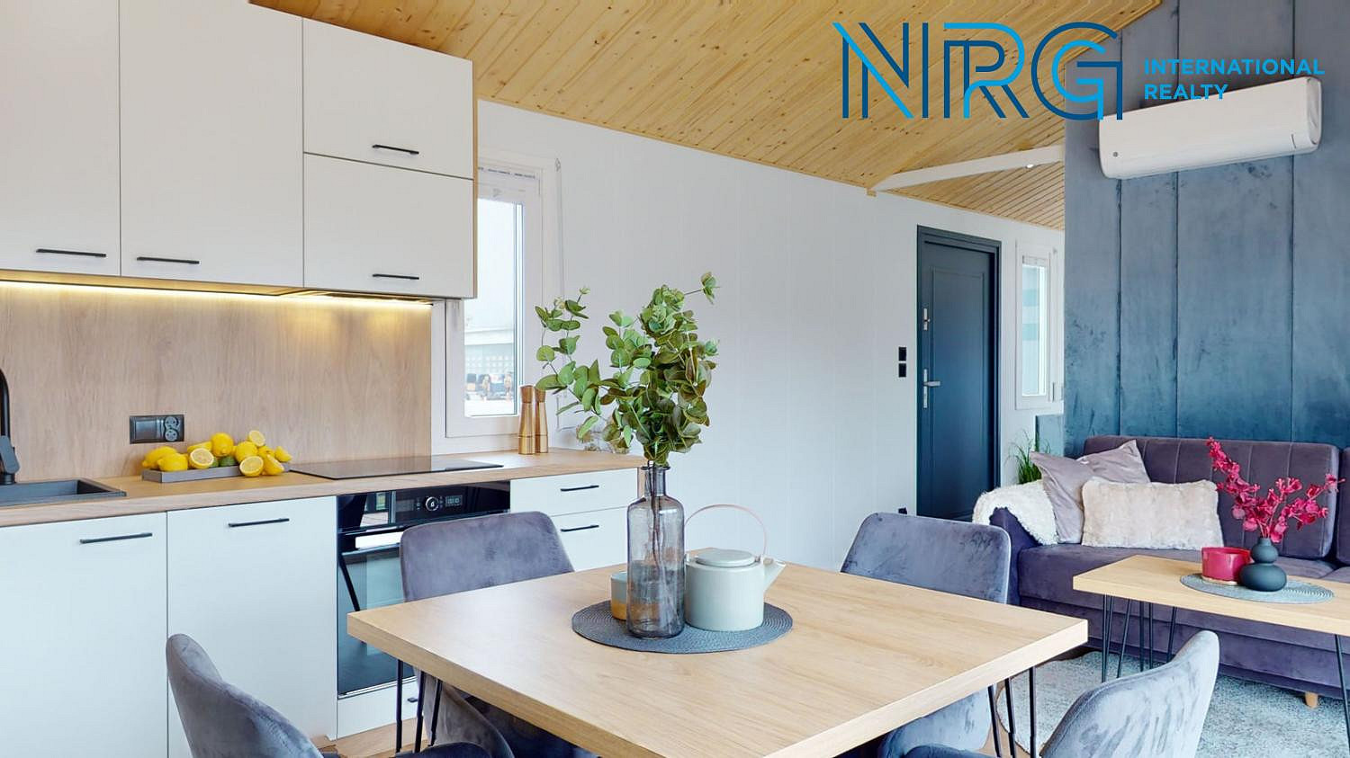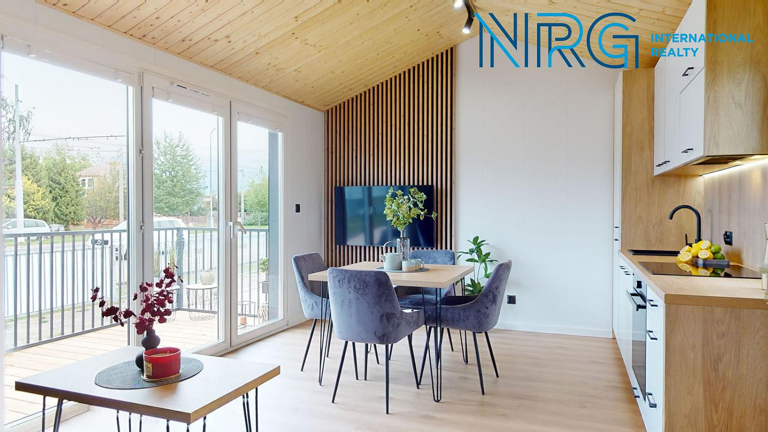 Dům o ploše 42 m², dispozičně 3+kk, ale reálně třetí místnost je velmi malá, vhodná jako šatna nebo pracovna. Je možnost malou místnost zrušit a zvětšit si obývák. V obýváku je vše otevřeno do štítu, tudíž i malému prostoru to dává dobrý pocit. Velkou výhodou je energetická nenáročnost domu. Dům má plechovou střechu, vnější obložení ze skandinávského smrku, minerální izolace ve stěnách a střeše, PUR pěna s otevřenými buňkami v podlaze, dřevěné příčky, plastová okna s dvojskly, vinylová podlaha. Vše je nové. V domě ještě nikdo nebydlel. Kuchyň je vybavená myčkou, ledničkou a malým mrazákem. Stěhování je možné cca v létě 2024. Foto je ze vzorového domu, v ceně tohoto domu není terasa, klimatizace a venkovní rolety. Vše je možné dodělat. Potřebné investice jsou přípojku kanalizace, která se nachází před pozemkem a vrt na studnu.