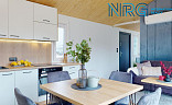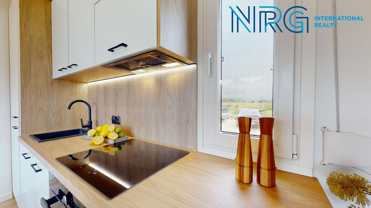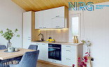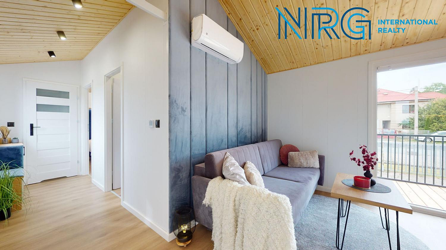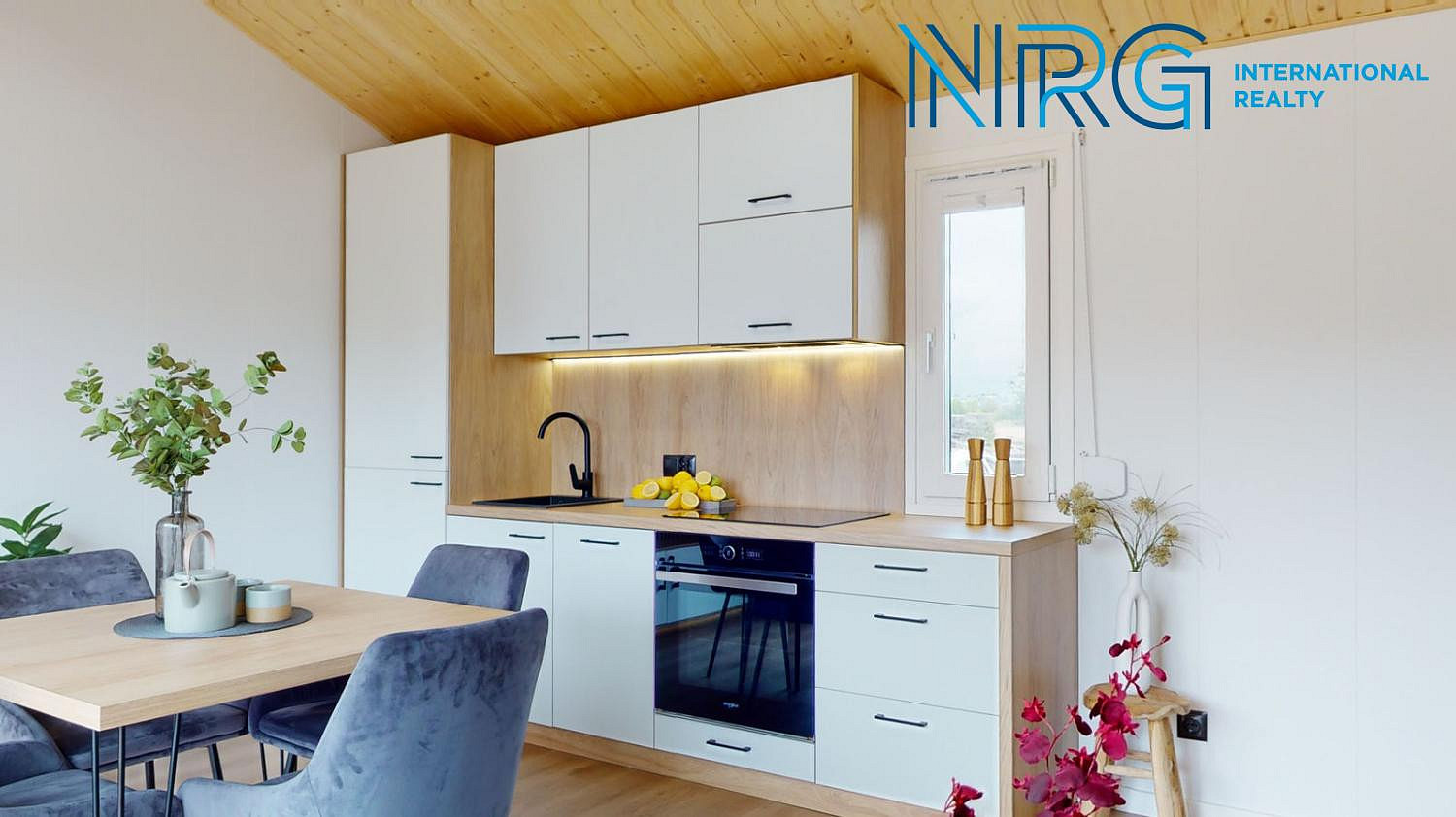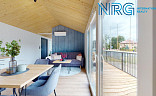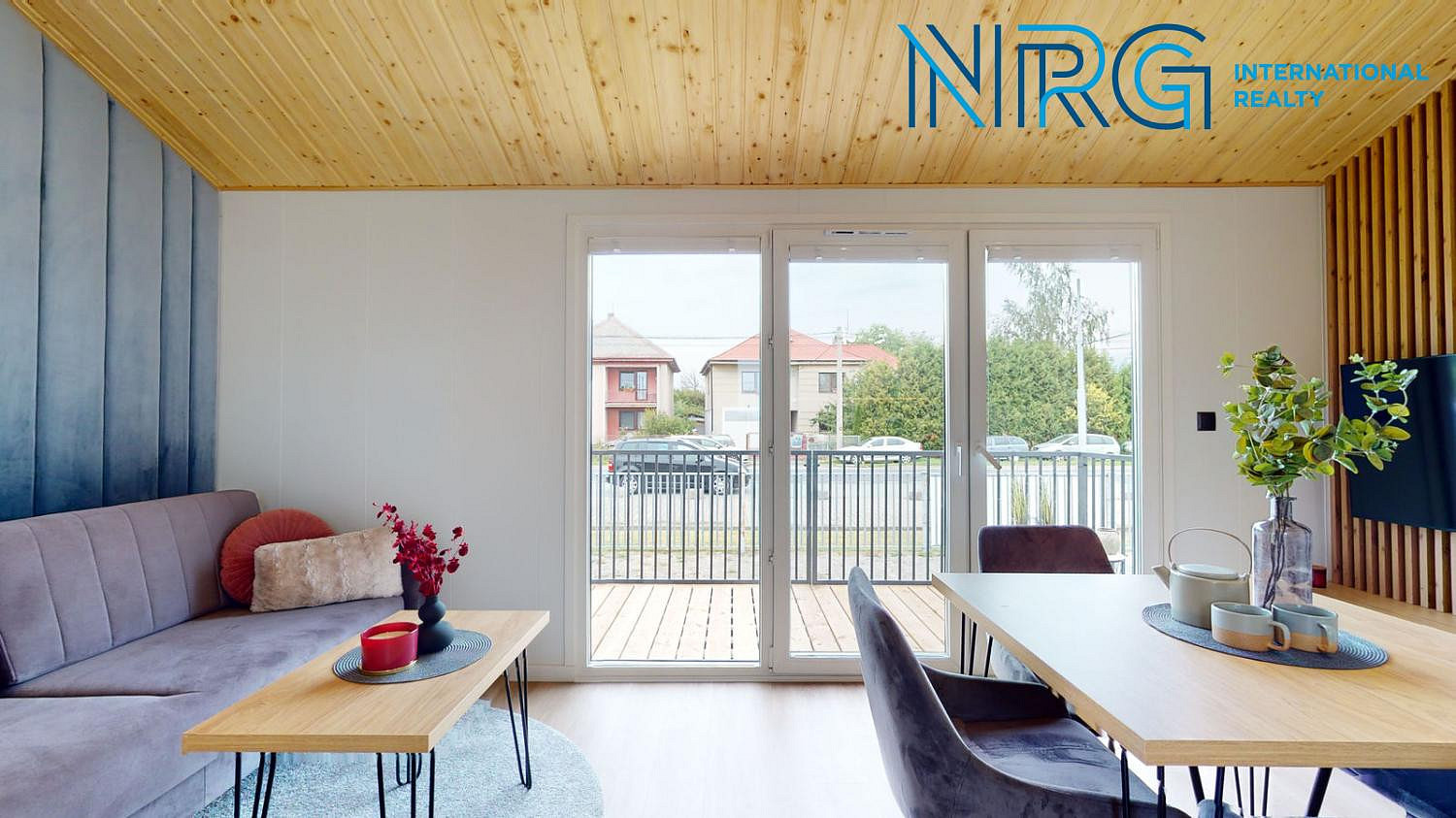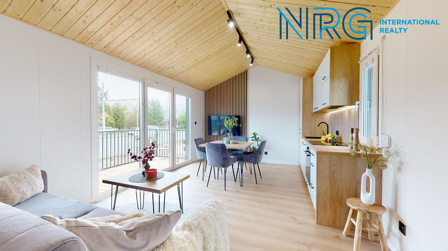 Dům o ploše 42 m², dispozičně 3+kk, ale reálně třetí místnost je velmi malá, vhodná jako šatna nebo pracovna. Je možnost malou místnost zrušit a zvětšit si obývák. V obýváku je vše otevřeno do štítu, tudíž i malému prostoru to dává dobrý pocit. Velkou výhodou je energetická nenáročnost domu. Dům má plechovou střechu, vnější obložení ze skandinávského smrku, minerální izolace ve stěnách a střeše, PUR pěna s otevřenými buňkami v podlaze, dřevěné příčky, plastová okna s dvojskly, vinylová podlaha. Vše je nové. V domě ještě nikdo nebydlel. Kuchyň je vybavená myčkou, ledničkou a malým mrazákem. Stěhování je možné cca v létě 2024. Foto je ze vzorového domu, v ceně tohoto domu není terasa, klimatizace a venkovní rolety. Vše je možné dodělat. Potřebné investice jsou přípojku kanalizace, která se nachází před pozemkem a vrt na studnu.