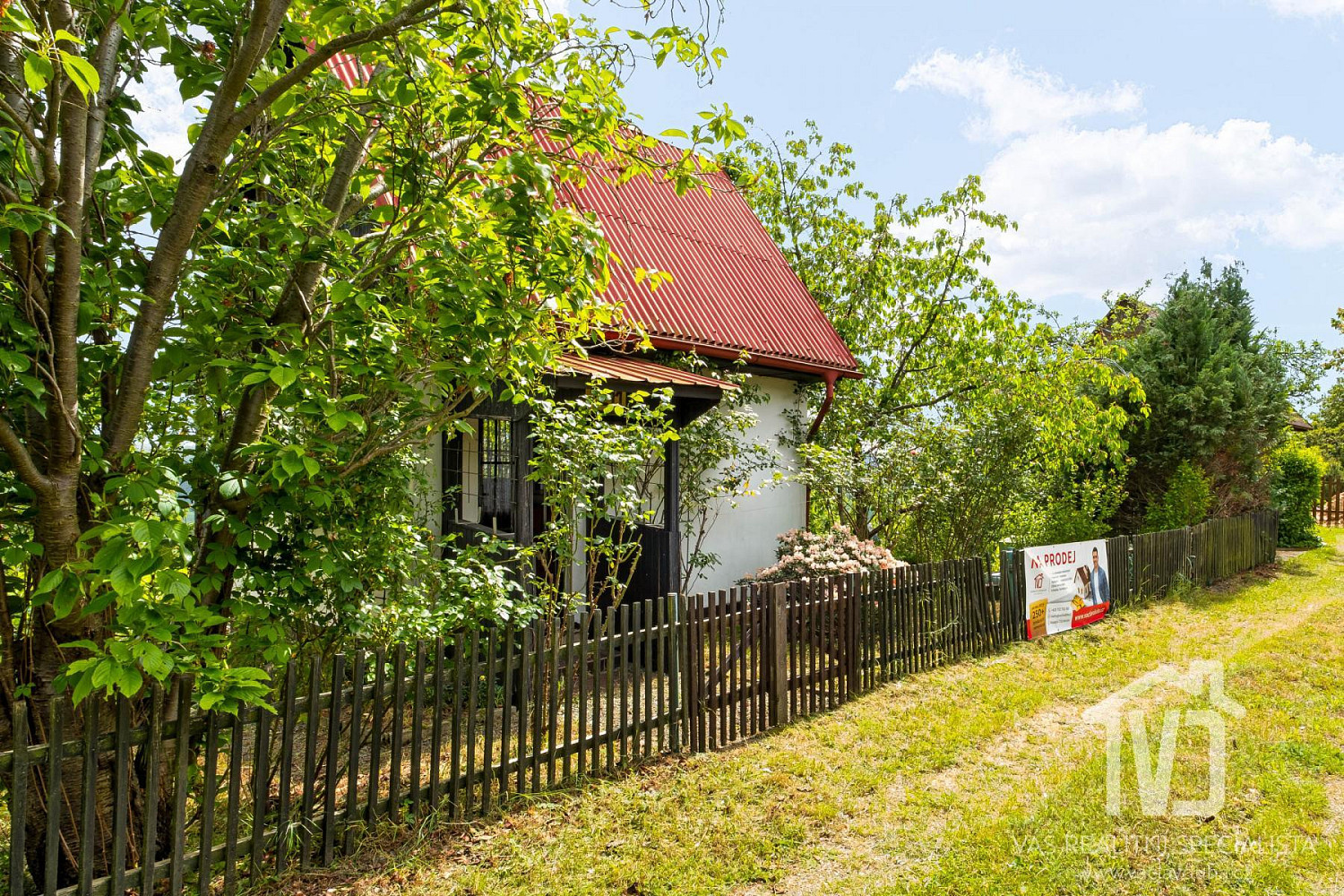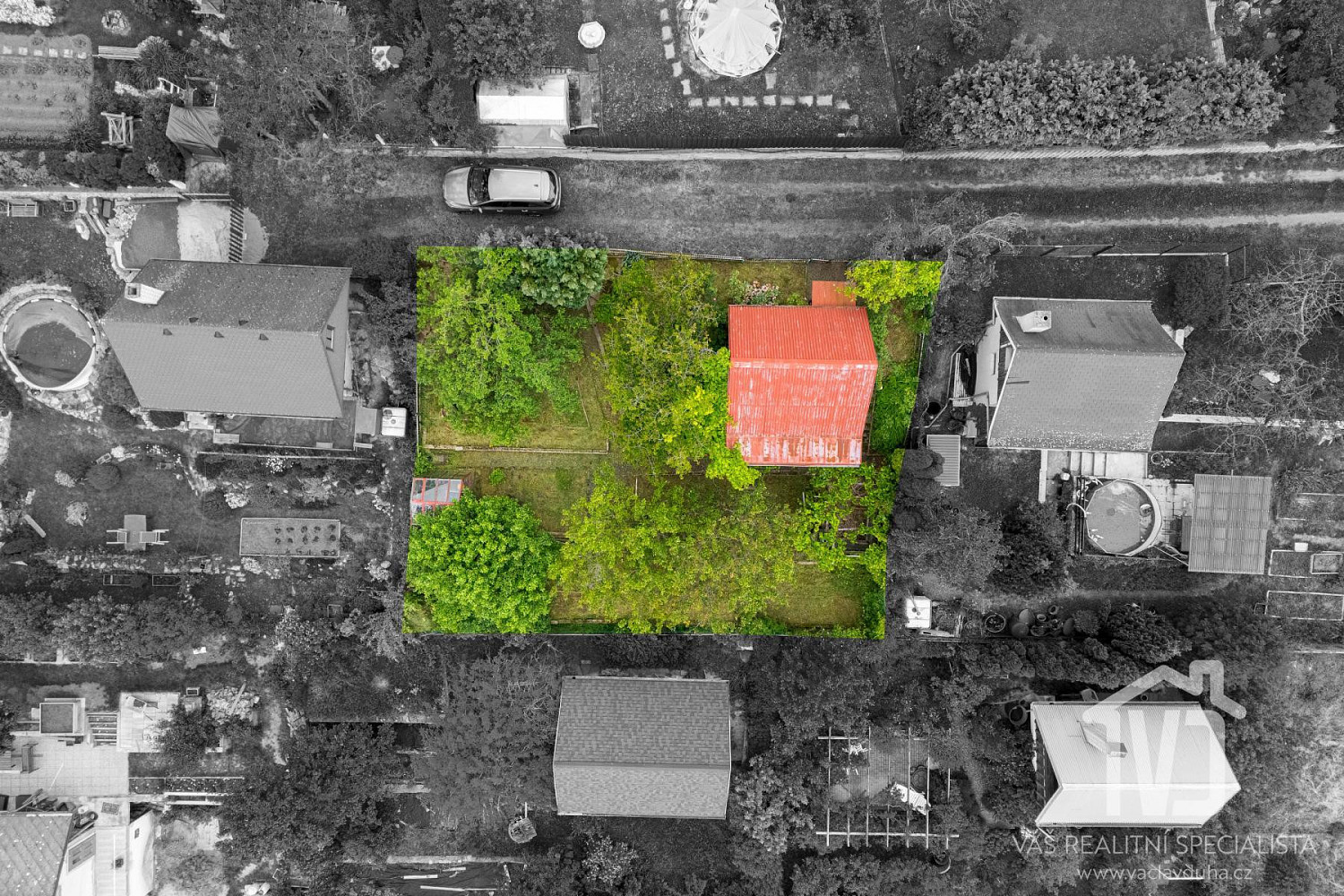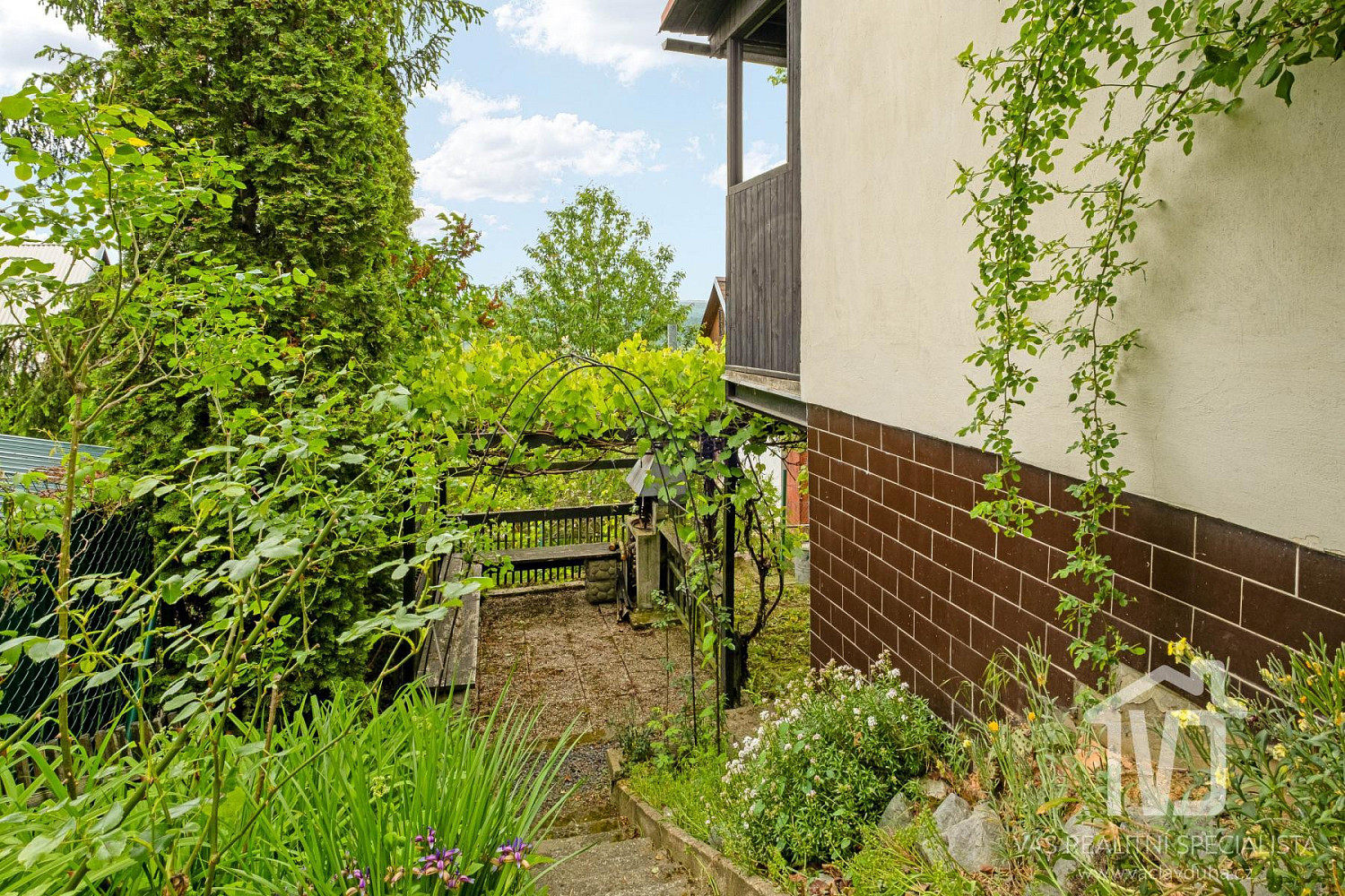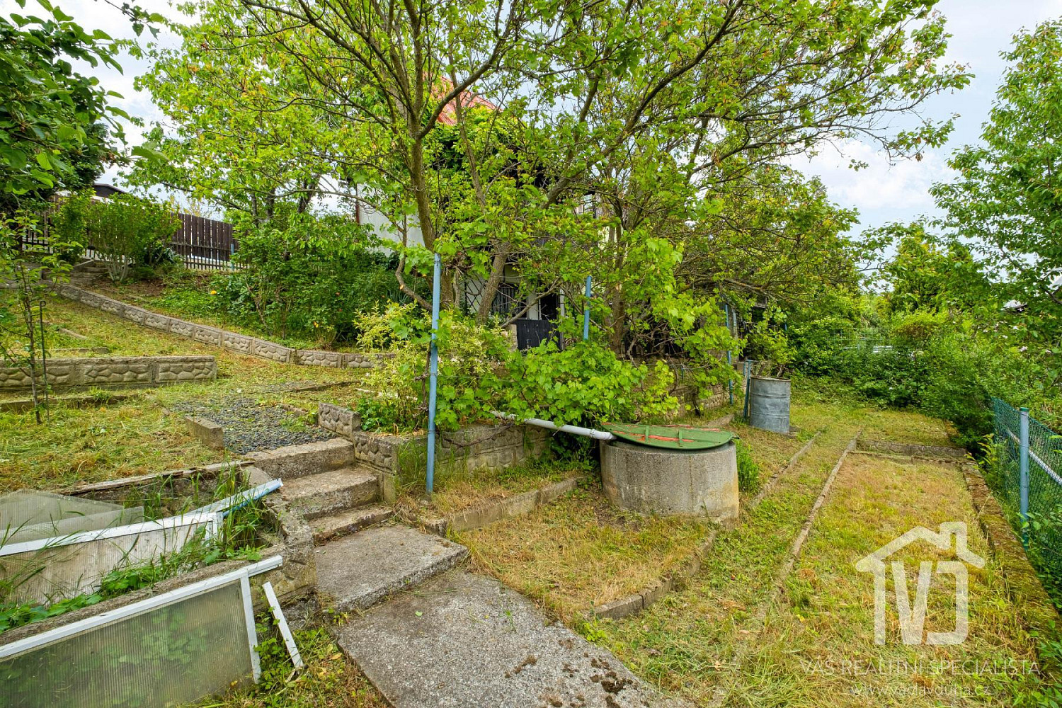 Pozemek má zpevněné parkování pro 1 vozidlo, skleník, nádrž na dešťovou vodu, sezení, vzrostlé stromy a záhony.