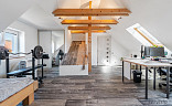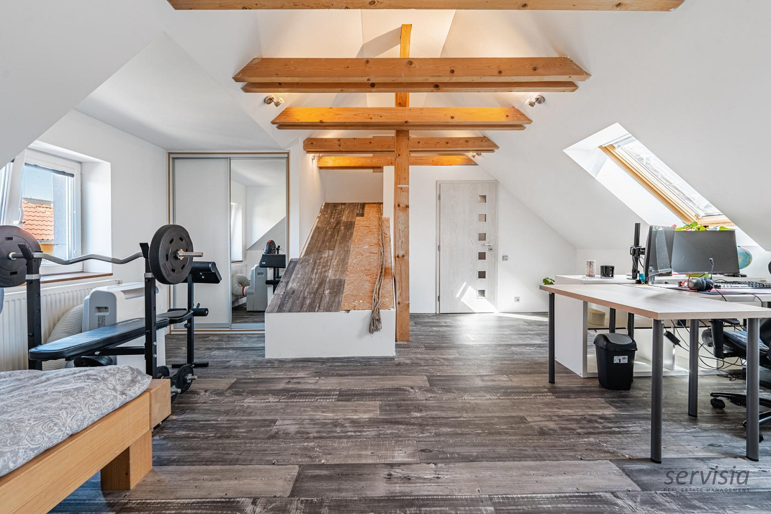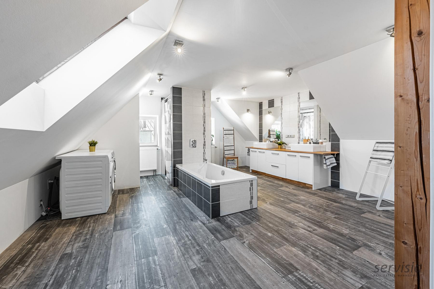 V horní části domu jsou umístěny 2 ložnice, šatna a prostorná koupelna o výměře 35 m², kde je umístěna vana i sprchový kout. Zároveň se zde nachází bojler a elektrokotel. Dům je vybaven centrálním vysavačem, který zajišťuje pohodlný a efektivní úklid.