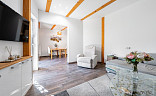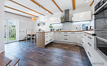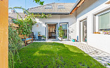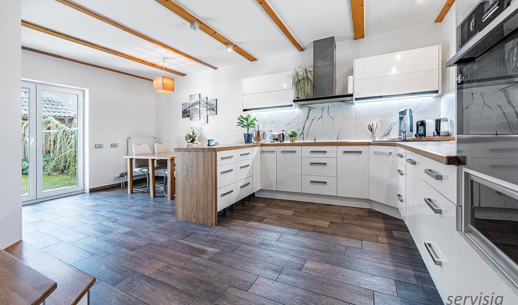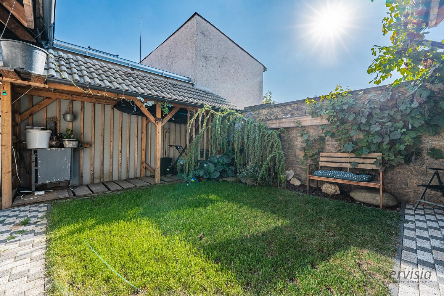 Při vstupu do domu je vpravo kuchyně spojená s obývacím pokojem, ze kterého je výstup na malou zahrádku o výměře cca 30 m², kde je možné nerušeně odpočívat.