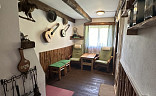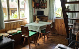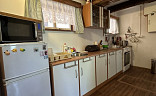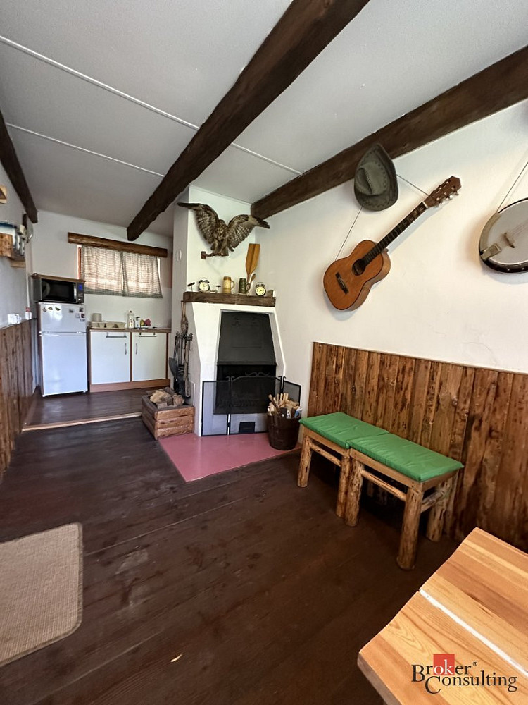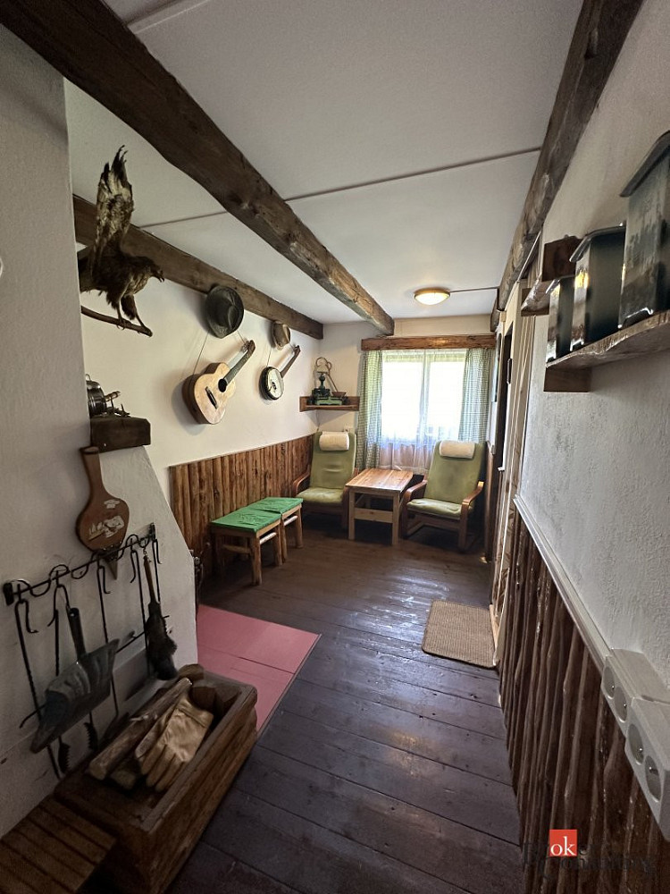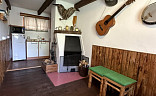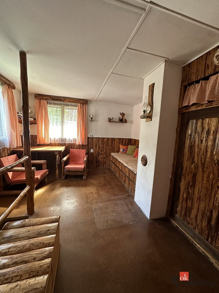 V přízemí chaty je kuchyňská linka se sezením a je zde možnost využití sklípku na uskladnění lahví , pití, potravin. Můžete si zde zatopit v krbu i v kamnech. Do chaty je zavedená elektřina , chemické wc , a voda je zde řešena studnou , která je pro celou osadu a není napojena do chaty. Možnost využití venkovní sprchy , která je navedena na ohřev.