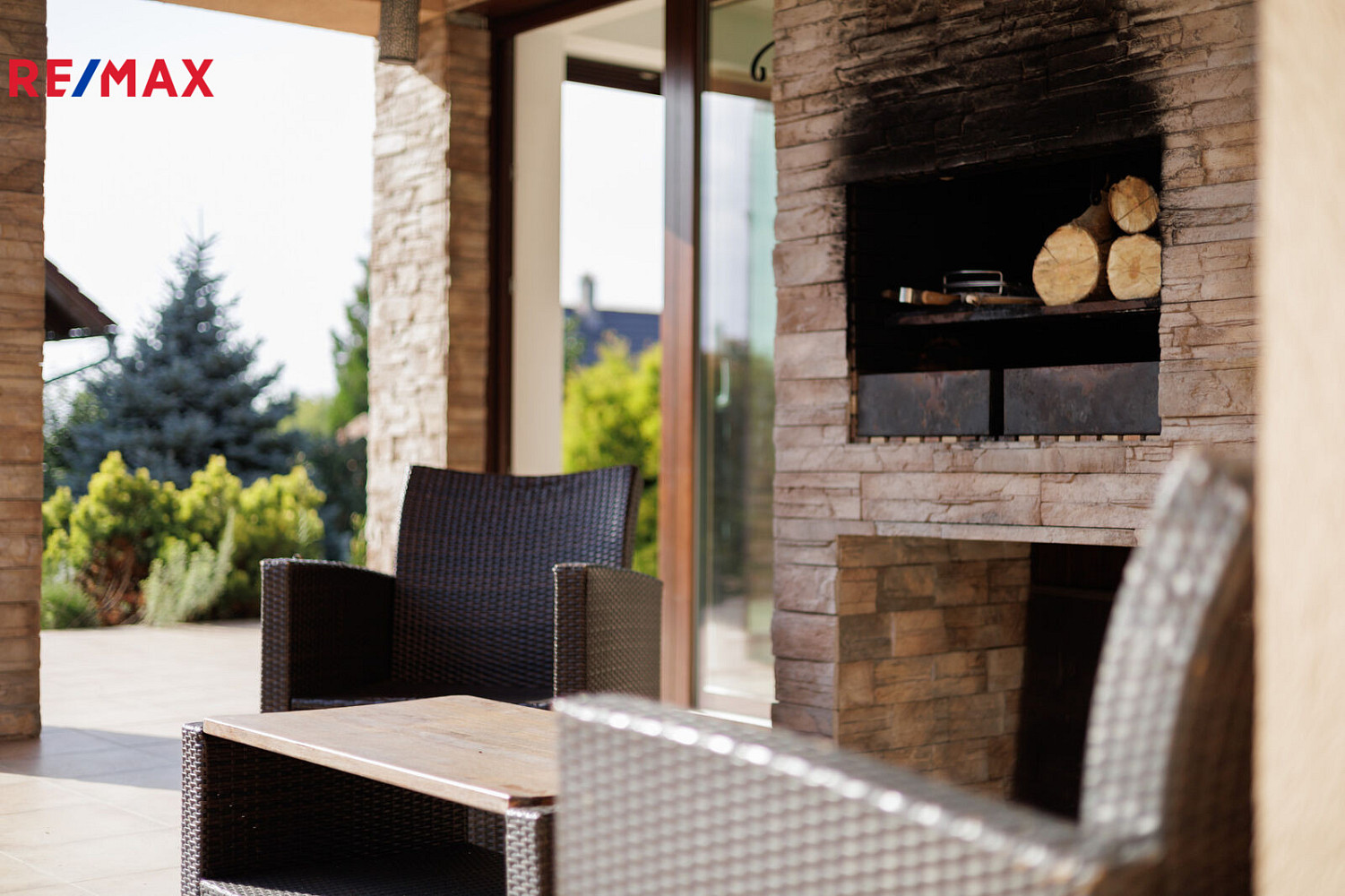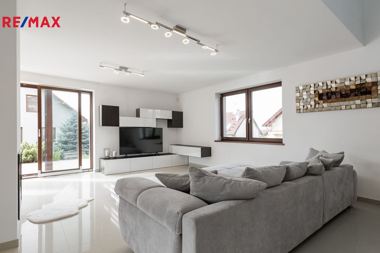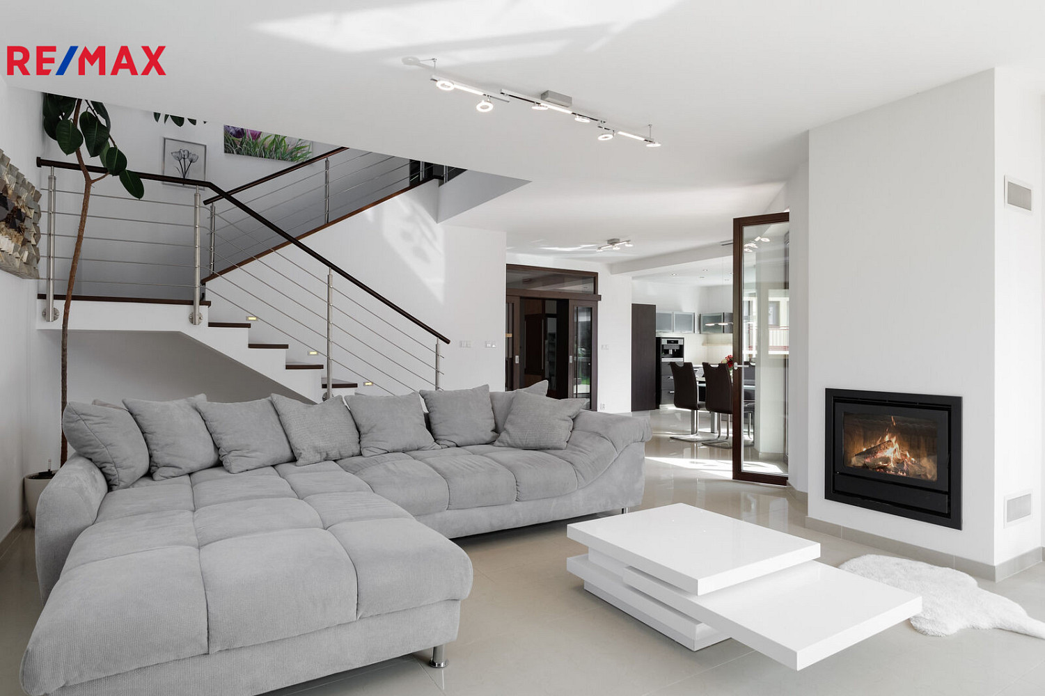 K přízemí patří obývací pokoj s na míru vyrobenou obývací stěnou. Plynový krbe, Vás v chladnějších měsících nejen zahřeje, ale působí v celém prostoru skvěle. Velkou výhodou obývacího pokoje a kuchyně je vstup na terasu, kde můžete u venkovního grilu s komínem posedět s přáteli nebo rodinou, a něco dobrého připravit. Jako pokoj pro hosty nebo pracovna byl vymyšlen prostor, který se nachází u vstupu do domu. Součástí pokoje je šatna. Přízemí disponuje koupelnou se sprchovým koutem a WC. V technické místnosti najdete vše potřebné pro běžný chod domu.