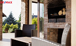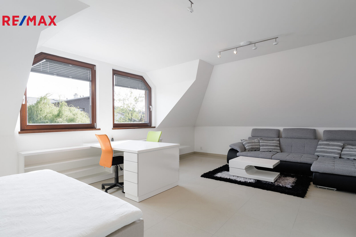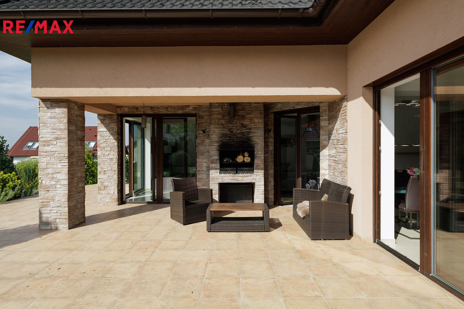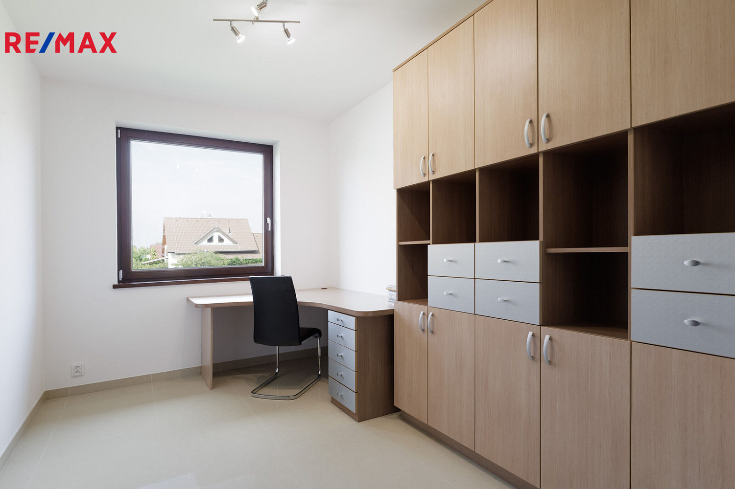 K přízemí patří obývací pokoj s na míru vyrobenou obývací stěnou. Plynový krbe, Vás v chladnějších měsících nejen zahřeje, ale působí v celém prostoru skvěle. Velkou výhodou obývacího pokoje a kuchyně je vstup na terasu, kde můžete u venkovního grilu s komínem posedět s přáteli nebo rodinou, a něco dobrého připravit. Jako pokoj pro hosty nebo pracovna byl vymyšlen prostor, který se nachází u vstupu do domu. Součástí pokoje je šatna. Přízemí disponuje koupelnou se sprchovým koutem a WC. V technické místnosti najdete vše potřebné pro běžný chod domu.