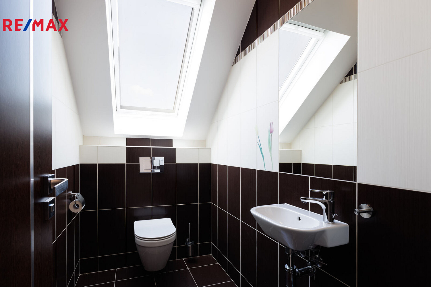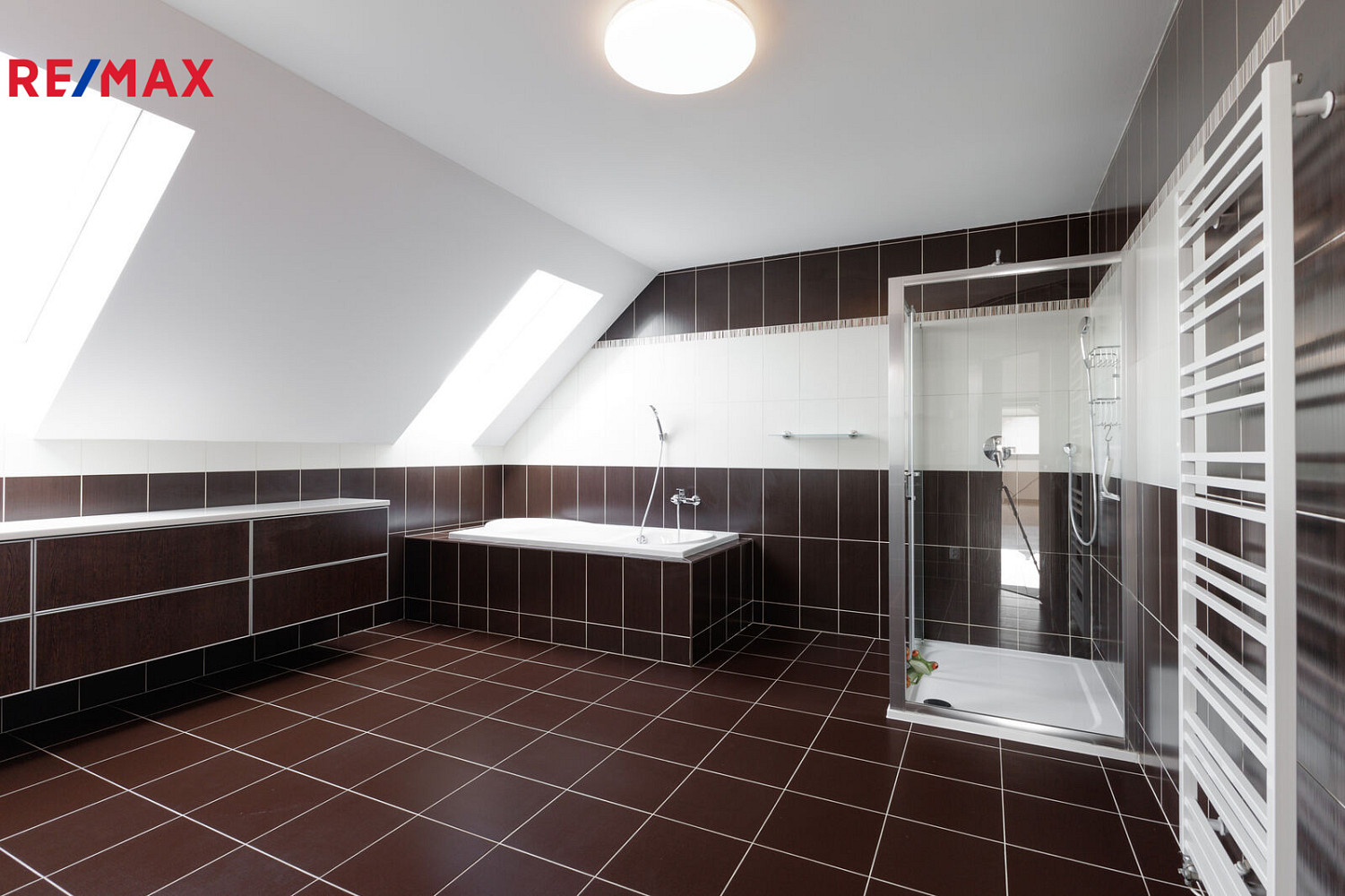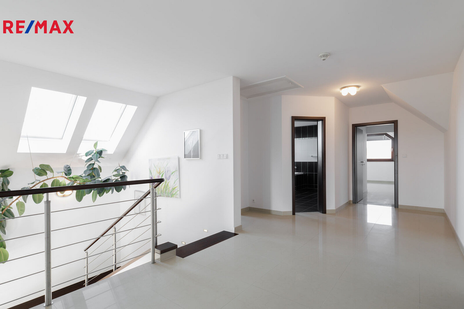 Při stoupání do prvního patra se nám nabídne prostorná chodba se vstupy do 3 ložnic, z nichž jedna z nich lze rozdělit na dva samostatné pokoje. Součástí každé ložnice je šatna s úložným prostorem. V prvním patře najdeme další koupelnu, tentokrát s vanou i se sprchovým koutem, dále pak samostatné WC.