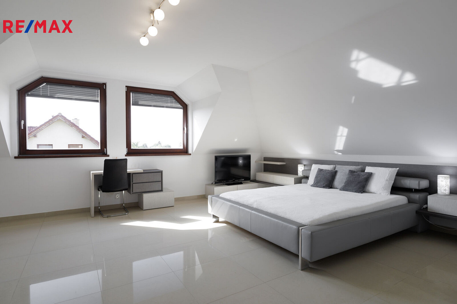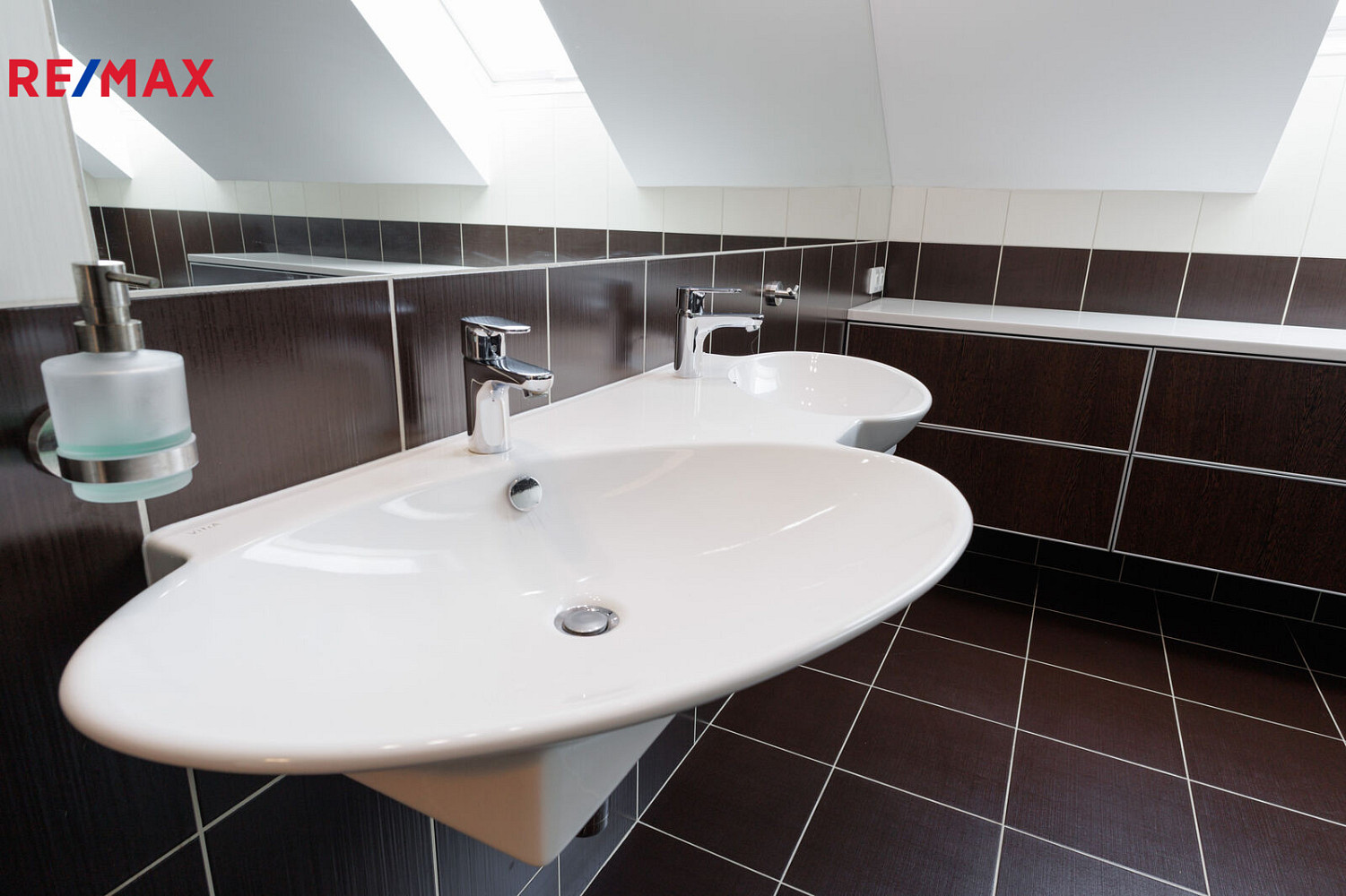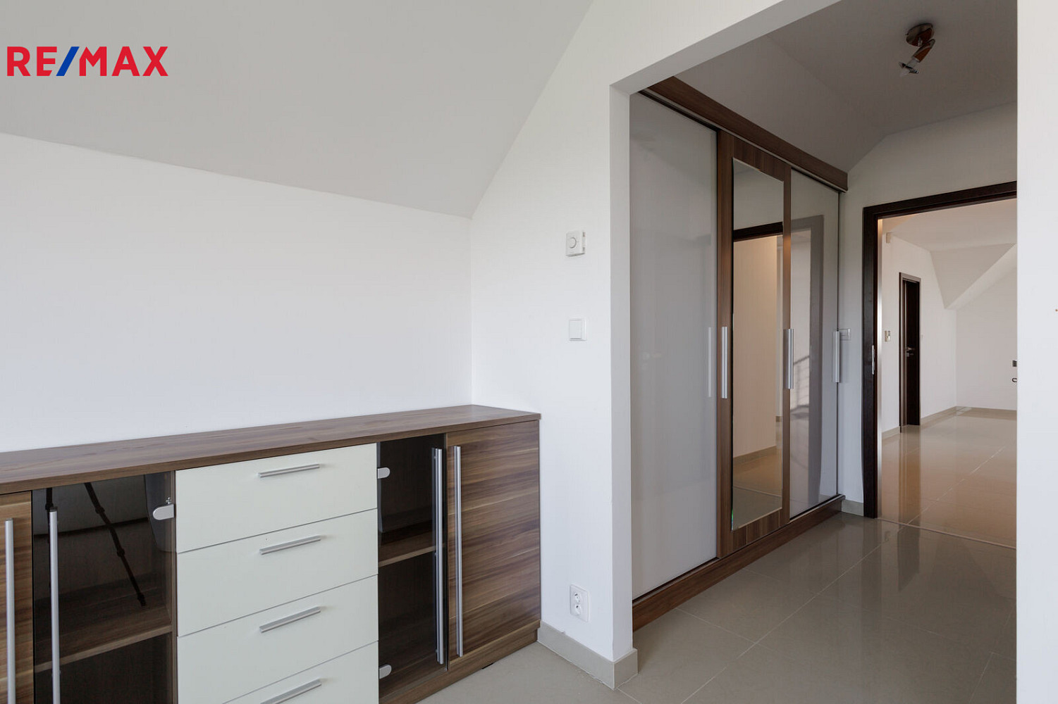 Při stoupání do prvního patra se nám nabídne prostorná chodba se vstupy do 3 ložnic, z nichž jedna z nich lze rozdělit na dva samostatné pokoje. Součástí každé ložnice je šatna s úložným prostorem. V prvním patře najdeme další koupelnu, tentokrát s vanou i se sprchovým koutem, dále pak samostatné WC.