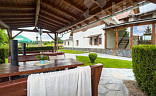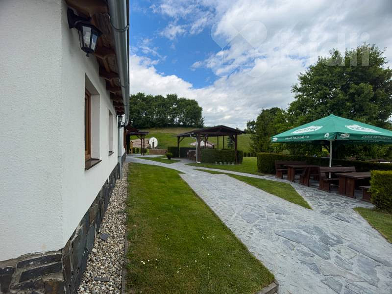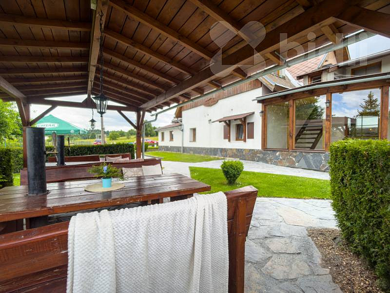 Na pozemku je zastřešená pergola s posezením pro dalších 56 hostů, stoly s výčepním zařízením, dále pergola s venkovním barem a grilem. Na zahradě je také bazén, dětské hřiště, dřevěné pódium. V zadní části zahrady je vinný sklípek a zahradní domek sloužící jako další bar s krytým posezením.